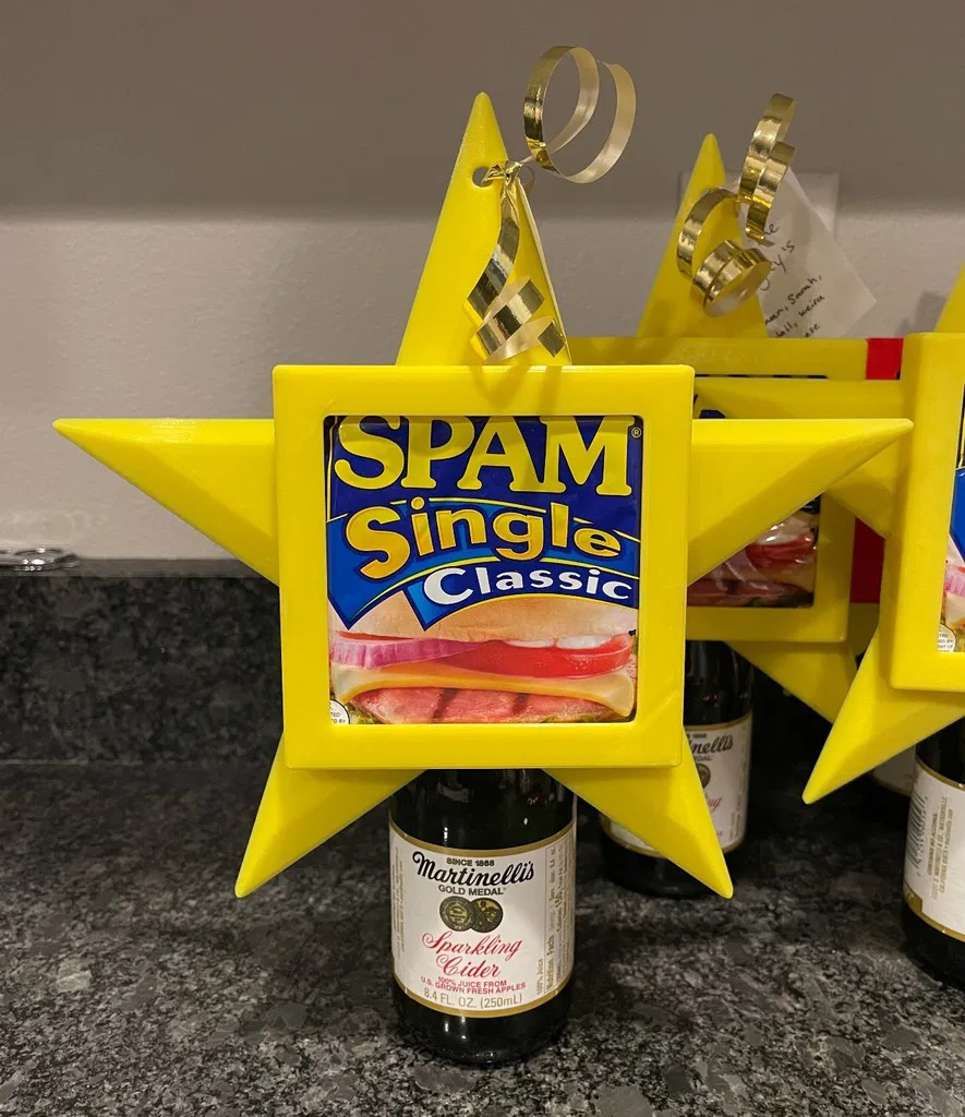 Món quà Giáng Sinh độc đáo cho bạn bè mê SPAM! Đỉnh cây thông hình ngôi sao 3D này có thể in dễ dàng và còn có thể làm đồ treo cây thông nữa. Hoàn hảo cho người yêu thích SPAM.