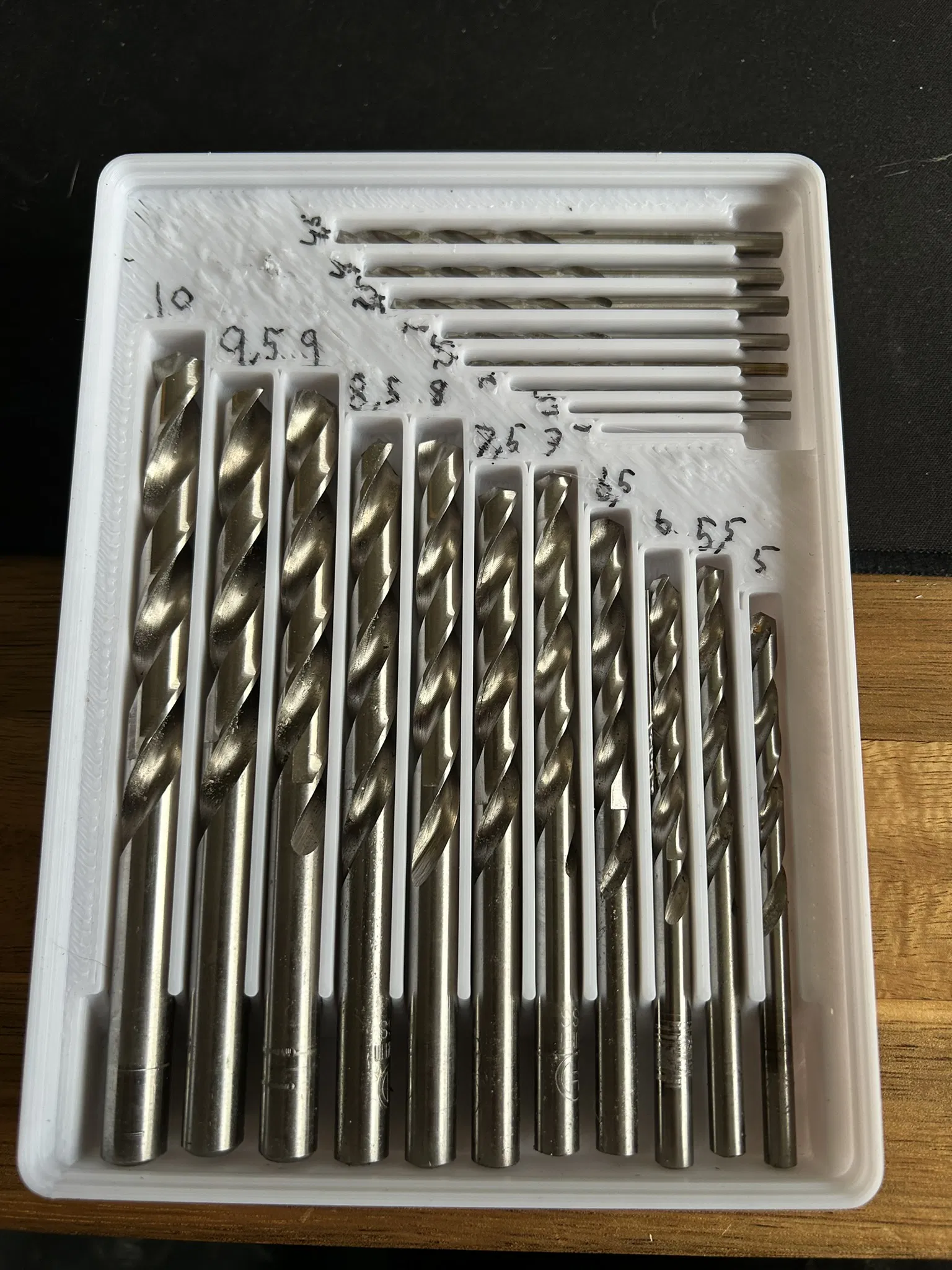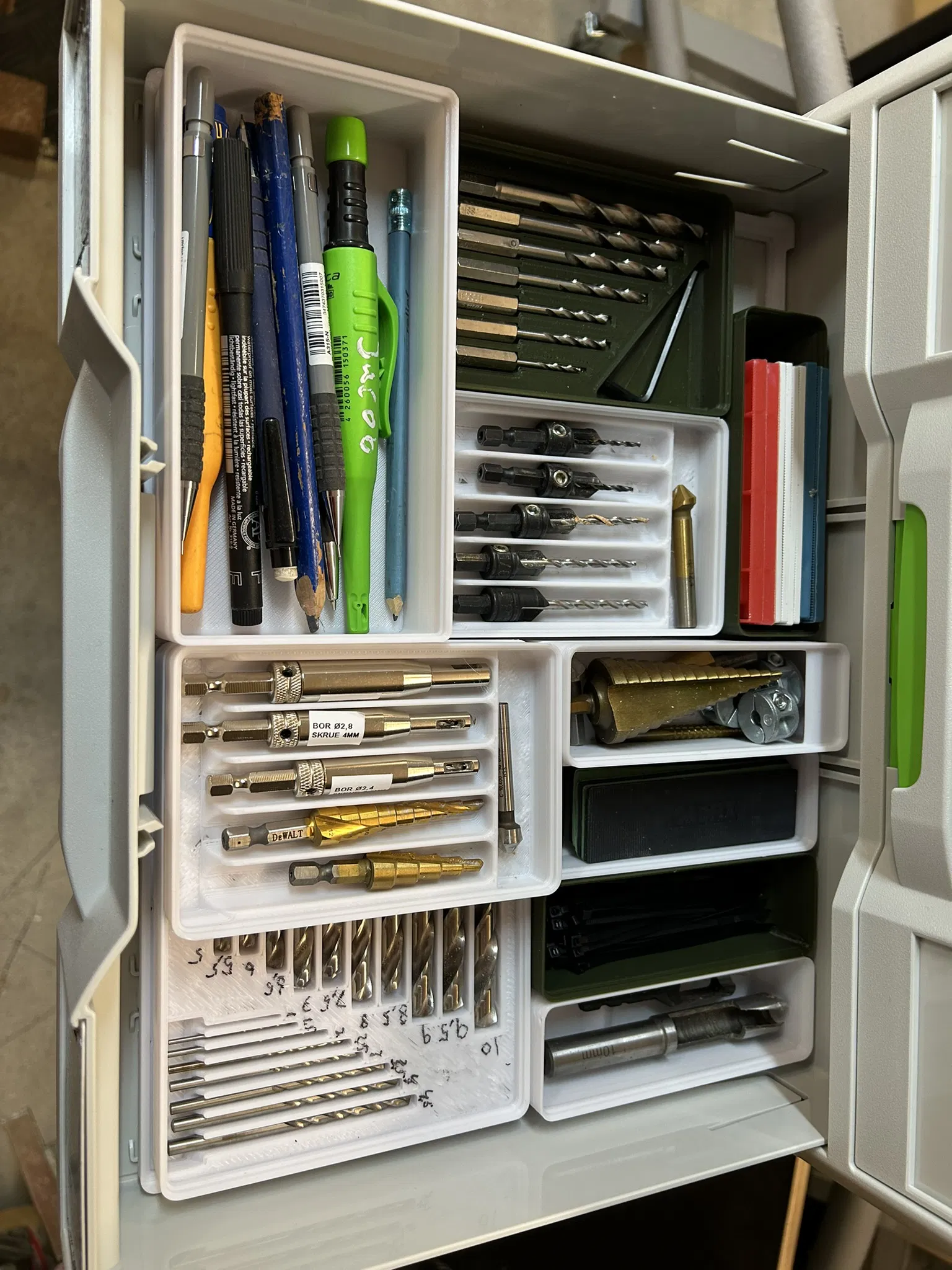 Giá đỡ Gridfinity cho mũi khoan Bosch, bao gồm cả mũi khoan xoắn và các mũi khoan ngẫu nhiên có đường kính lên tới Ø13mm. Phù hợp để lưu trữ bộ mũi khoan Bosch 8 chi tiết mũi nhọn và bộ 13 chi tiết mũi xoắn HSS.