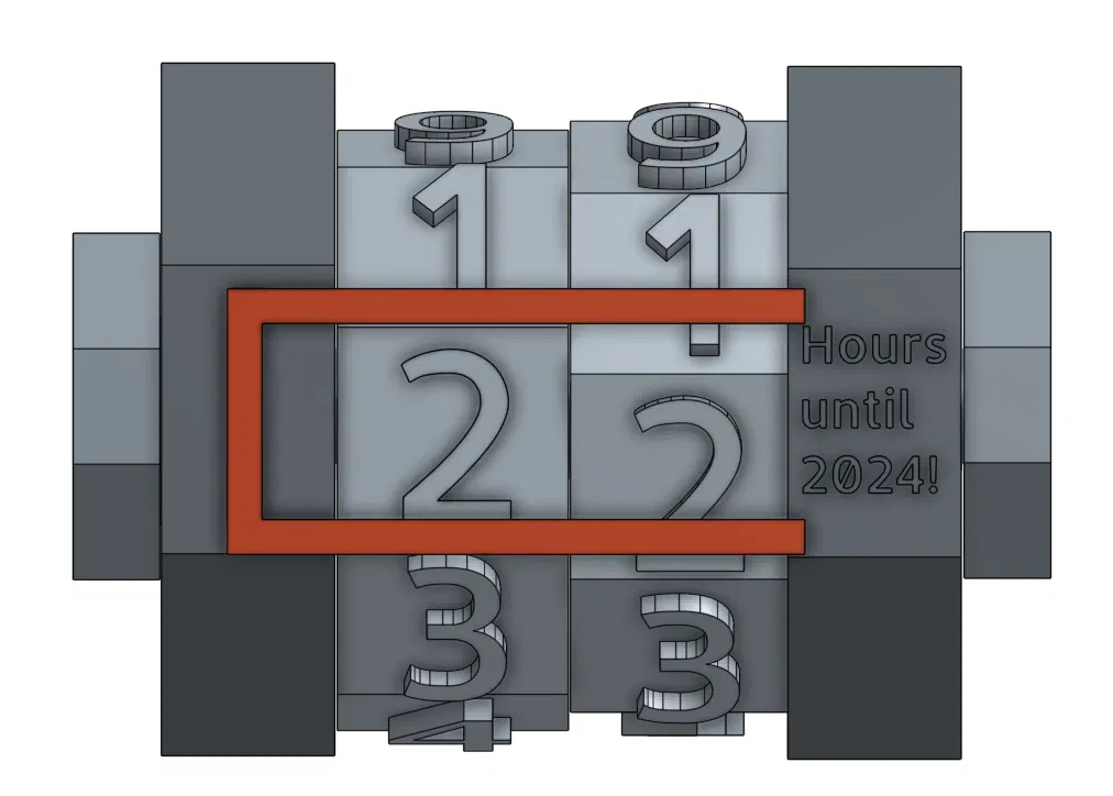 Tết Tây sắp tới rồi, tui muốn đếm ngược số giờ cho đến nửa đêm ngày 1/1/2024, nên tui đã thiết kế cái mô hình gọn gàng (dễ dàng thay đổi kích thước) này để giúp tui làm chuyện đó.