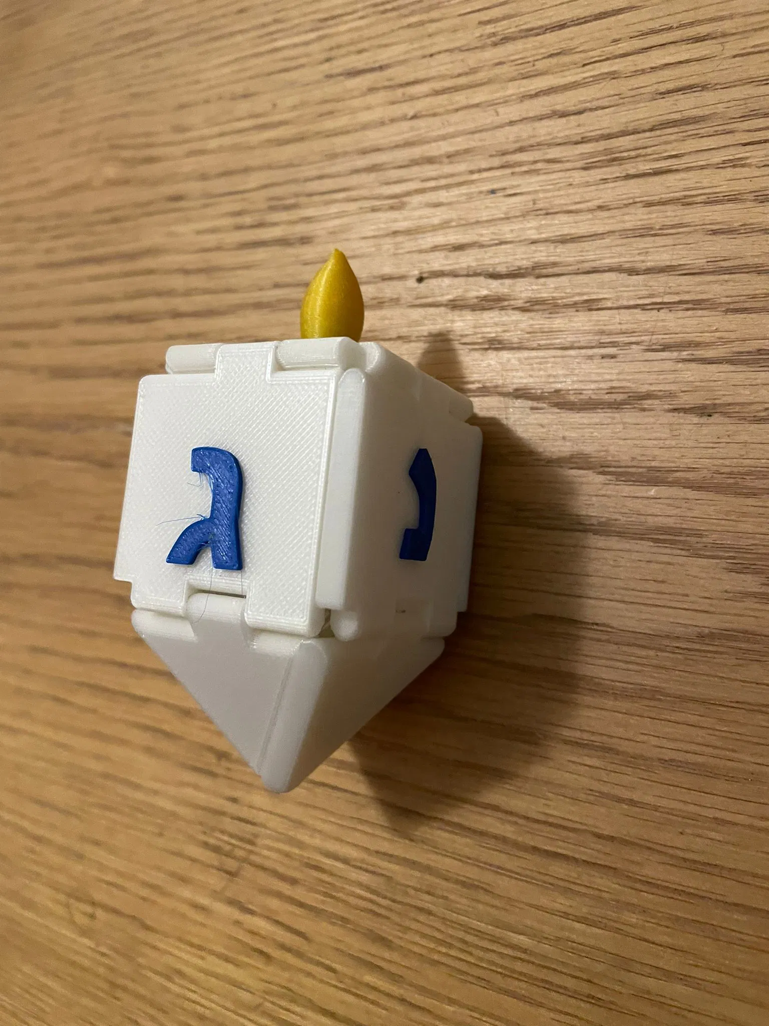 Cái dreidel này in xong là xài luôn, không cần chống dính hay ráp nối gì hết trơn. In ra một mảnh rồi gấp các mặt lại là xong.