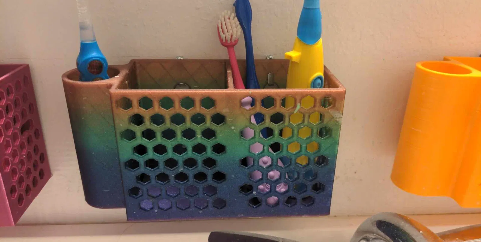 Nó có phiên bản trơn và phiên bản lục giác. Có thể treo bằng móc Command hoặc móc treo tranh. Nó có khe cắm bàn chải đánh răng có lỗ thoát nước và 2 ngăn để đựng đồ.