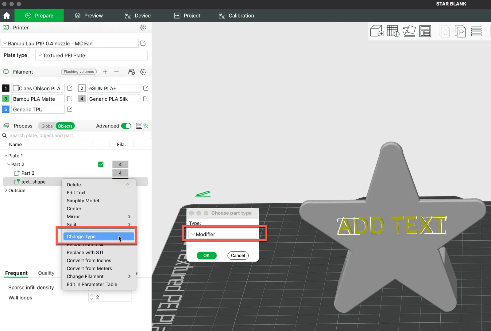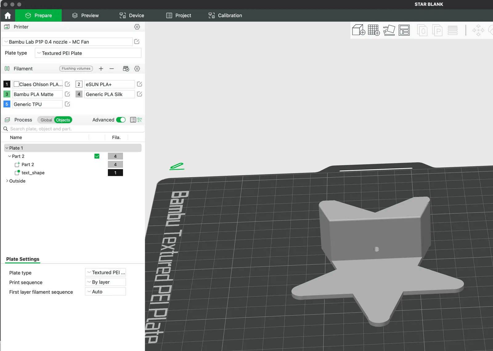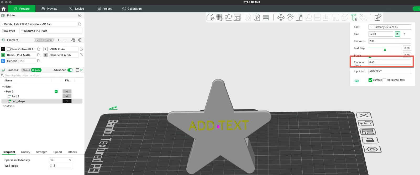 Hình ngôi sao nghiêng mà bạn có thể thêm văn bản của riêng mình vào. Tôi đã thêm văn bản của mình trong Bambu Studio hoặc Prusa slicer, đặt độ sâu nhúng thành 0,4 mm, sau đó tô màu và thay đổi loại thành “modifier”, rồi đặt nó nằm phẳng trên khay in và cắt lát.