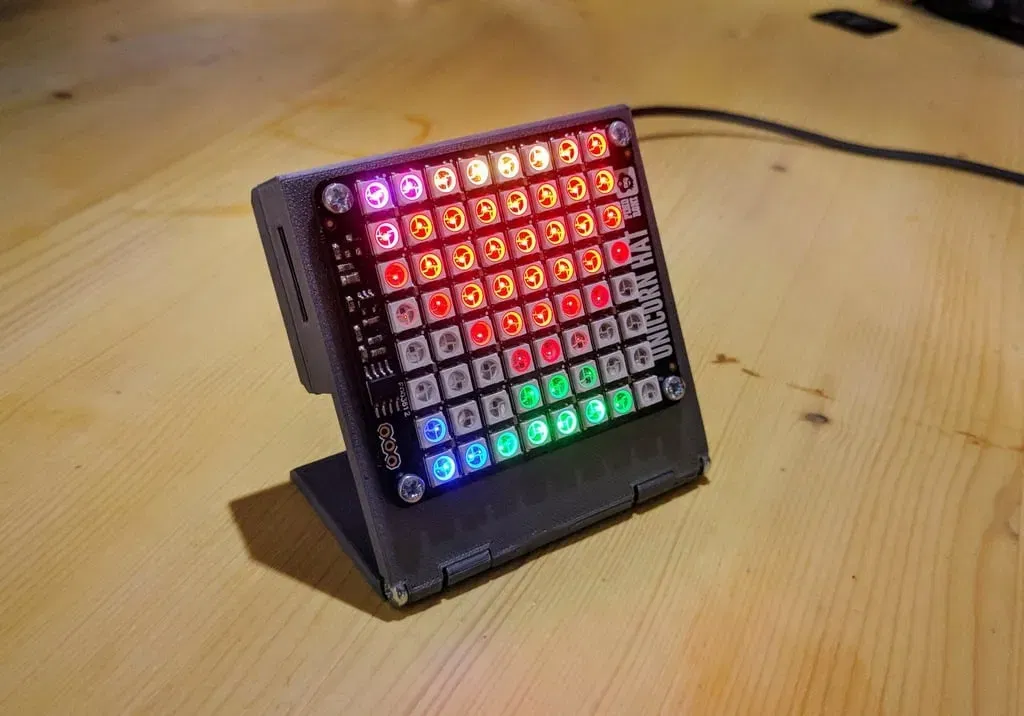 Một giá đỡ cho một Raspberry Pi Zero và Hat (hoặc Phat) với một cơ sở có bản lề cho phép một góc hiển thị có thể điều chỉnh. Ở đó…