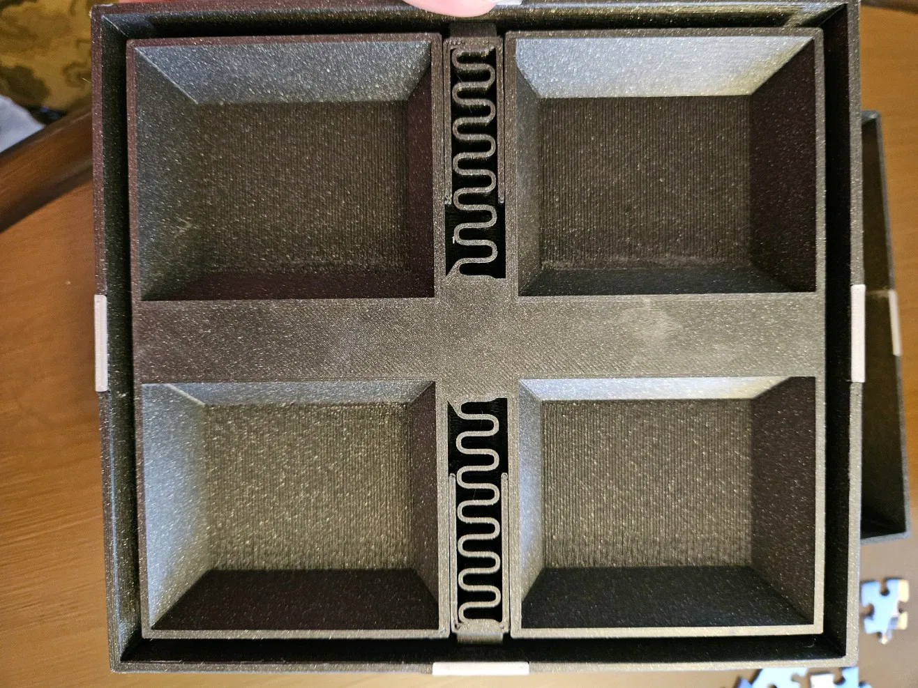 Thú thật là cũng phải chỉnh sửa hậu kỳ chút đỉnh. Chắc là do tui chỉ dùng hỗ trợ dạng sơn (Paint-on supports) cho 4 góc lượn 90 độ bên trong rãnh của thanh trượt thôi. Thành ra tui phải mài lại mấy cái góc bên trong thanh trượt với lại mấy cái khe nhận lẫy ở bên hông hộp chút. Không tốn nhiều công lắm đâu, nhưng mà tui cũng không dám nói là cái mẫu này hoàn hảo liền sau khi in xong đâu. Dù sao thì tui cũng khá là ưng ý với kết quả này.