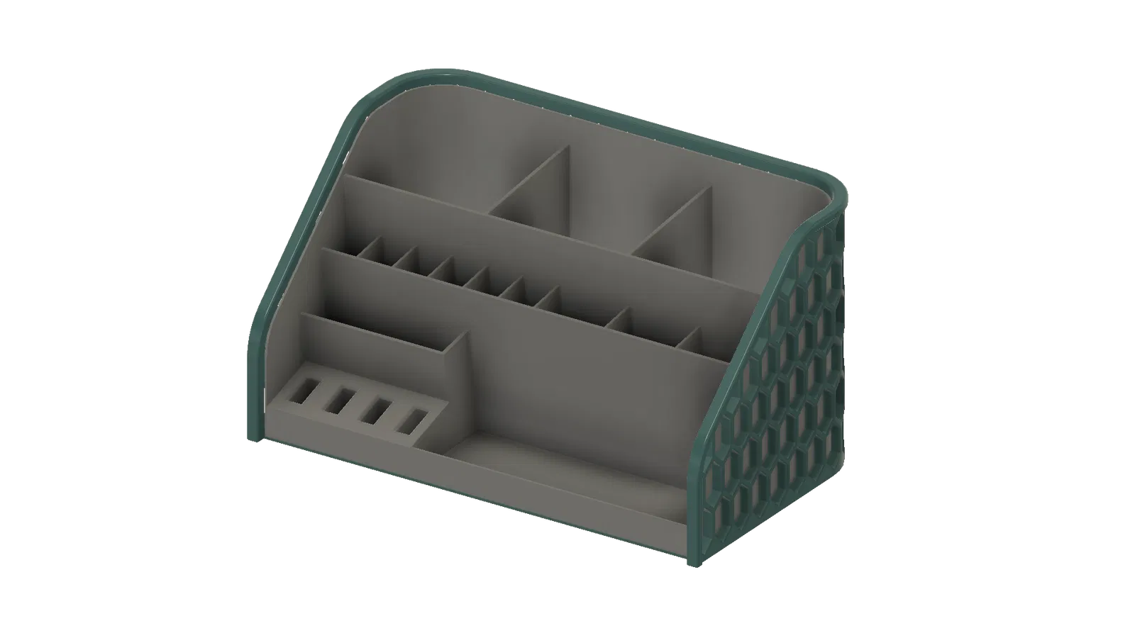 Bộ sắp xếp bàn làm việc 2 phần này dùng để đựng bút chì, bút dạ, danh thiếp, USB, kéo... với rổ lục giác 'đan' độc đáo. Có nhiều ngăn tiện lợi cho mọi vật dụng nhỏ trên bàn làm việc của bạn. In không cần hỗ trợ, có tùy chọn in 2 màu.