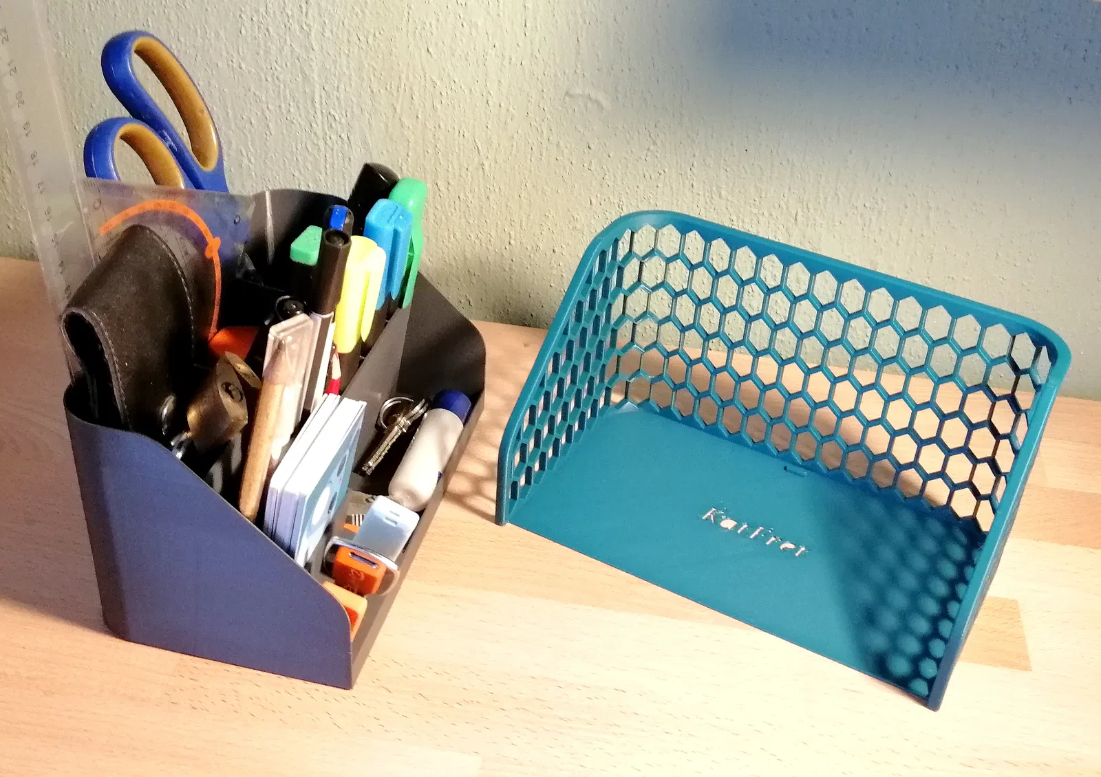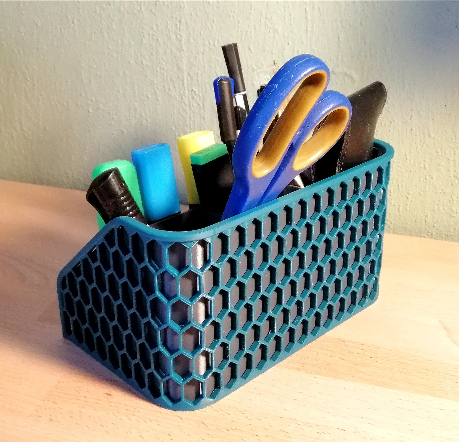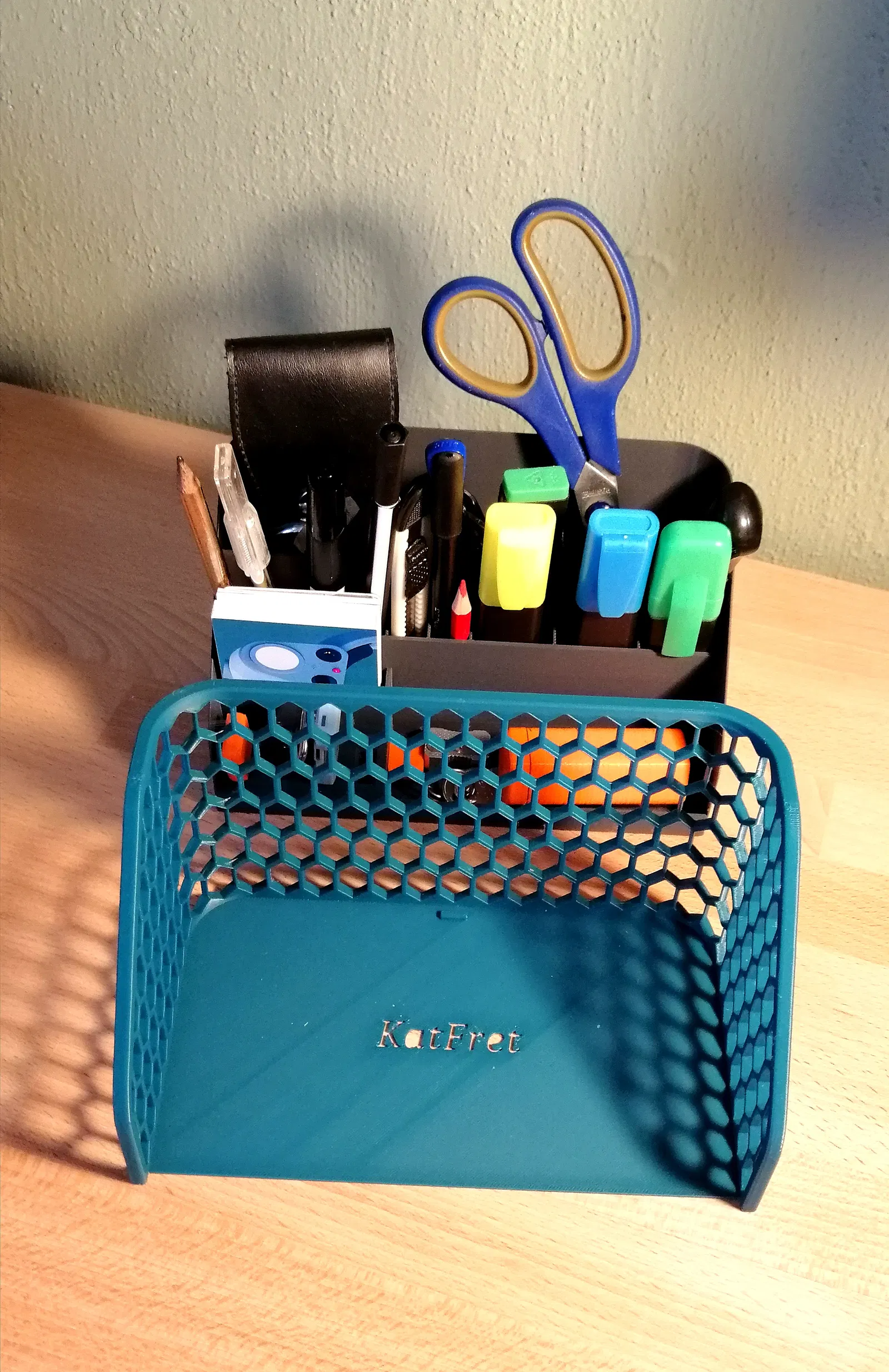Nó gồm 2 phần: ngăn bên trong, bản thân nó đã là một bộ sắp xếp bàn làm việc chức năng. Và cái rổ bên ngoài, để trang trí với hoa văn lục giác 'đan' và viền.