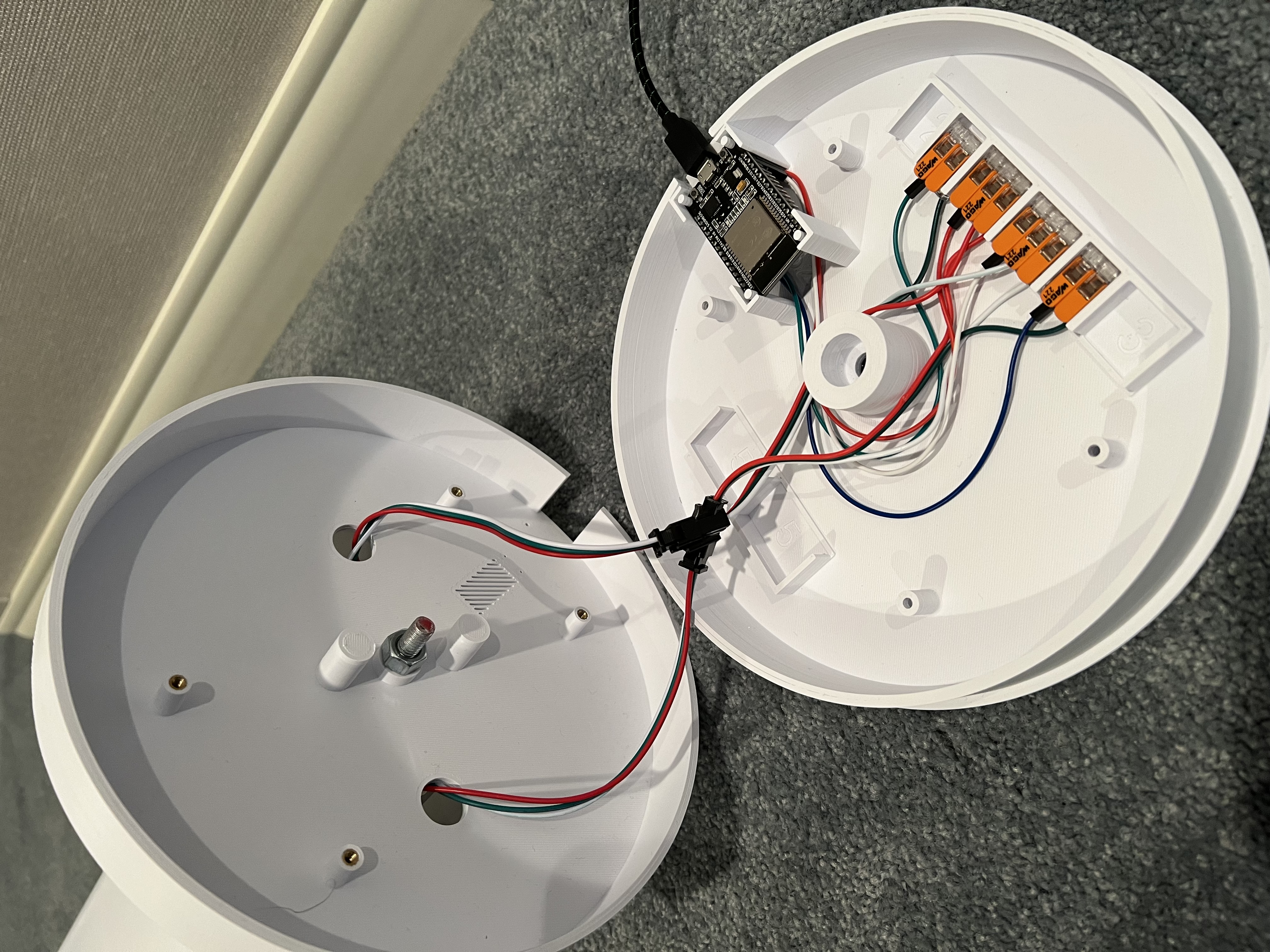 Đèn này chạy hoàn toàn bằng điện áp 5v từ ESP32. Vì vậy, nó chỉ cần một cáp USB duy nhất để cấp nguồn cho toàn bộ thiết bị. Mình nghĩ bạn có thể không cần dùng nguồn phụ vì số lượng đèn LED không quá nhiều. Có thể lắp hai dải đèn LED vào các rãnh nếu bạn muốn ánh sáng thật sự sáng. Nhưng ngay cả như vậy, mình tin rằng nó vẫn dưới giới hạn cần thiết cho một nguồn điện riêng biệt.