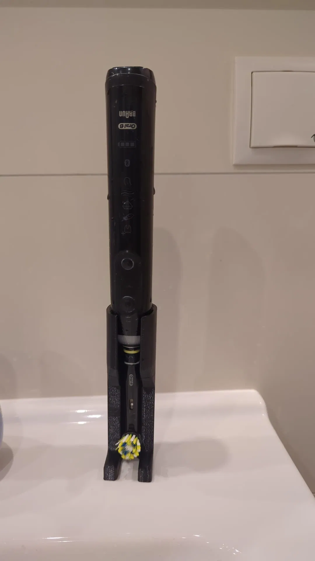 Đây là một cái đế giữ bàn chải đánh răng Oral B được thiết kế theo kiểu ngược, với phần đầu bàn chải hướng xuống dưới. Sản phẩm này giúp bạn cất giữ bàn chải một cách gọn gàng và tiện lợi.