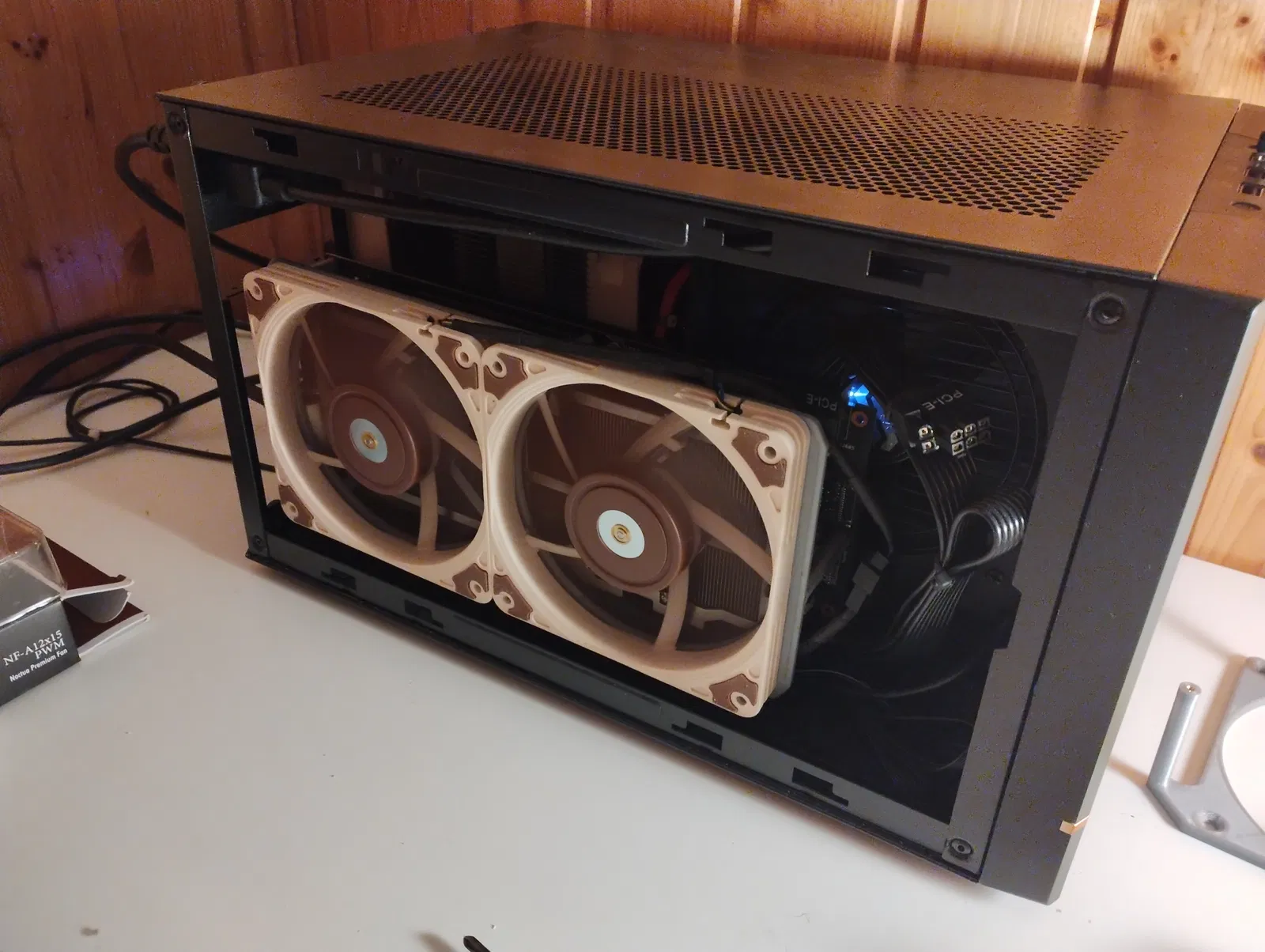 Các quạt, trong trường hợp của mình là quạt tản nhiệt mỏng Noctua NF-A12x15, được gắn bằng ốc quạt tự ren thông thường từ bên dưới - bất kỳ quạt 120 mm nào cũng xài được, miễn là có khoảng cách lỗ 105 mm.