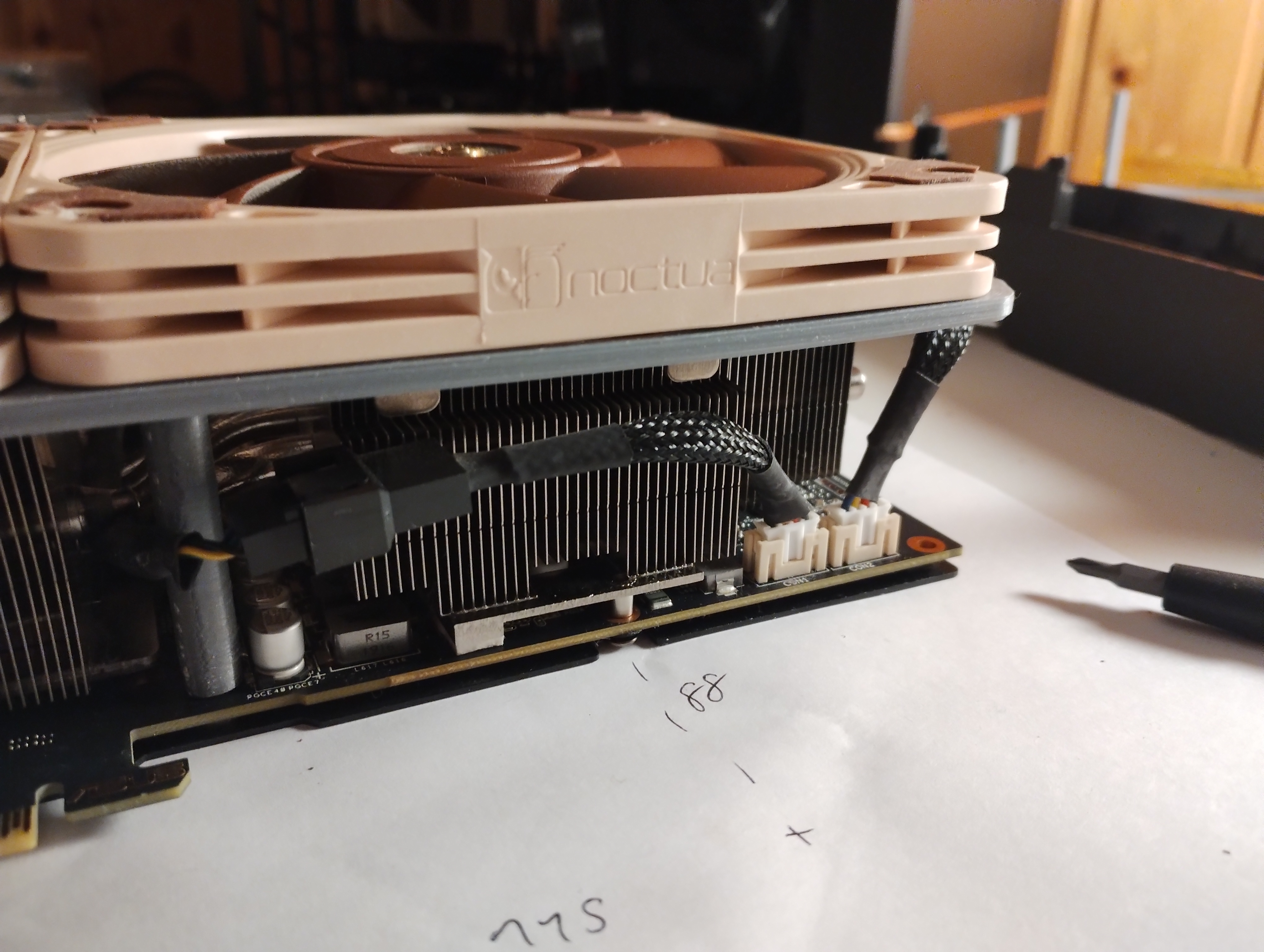 Để kết nối quạt, có thể tìm adapter từ jack PWM 4 pin thông thường sang loại jack nhỏ hơn dùng trên GPU ("PWM-VGA adapter").
