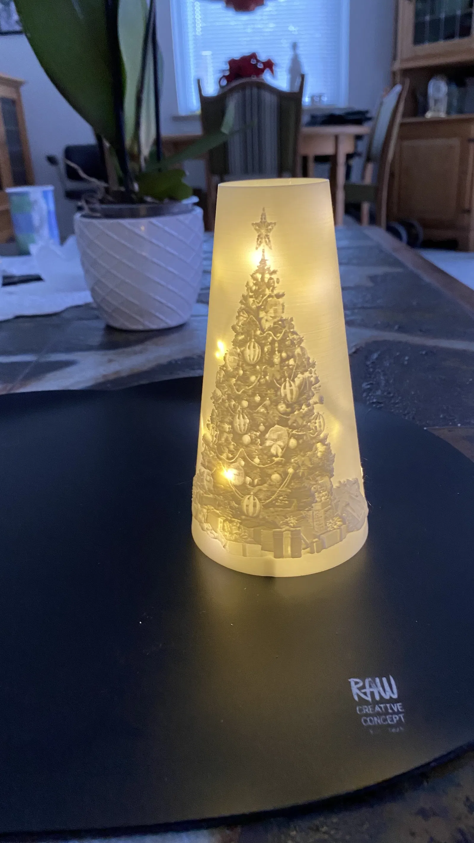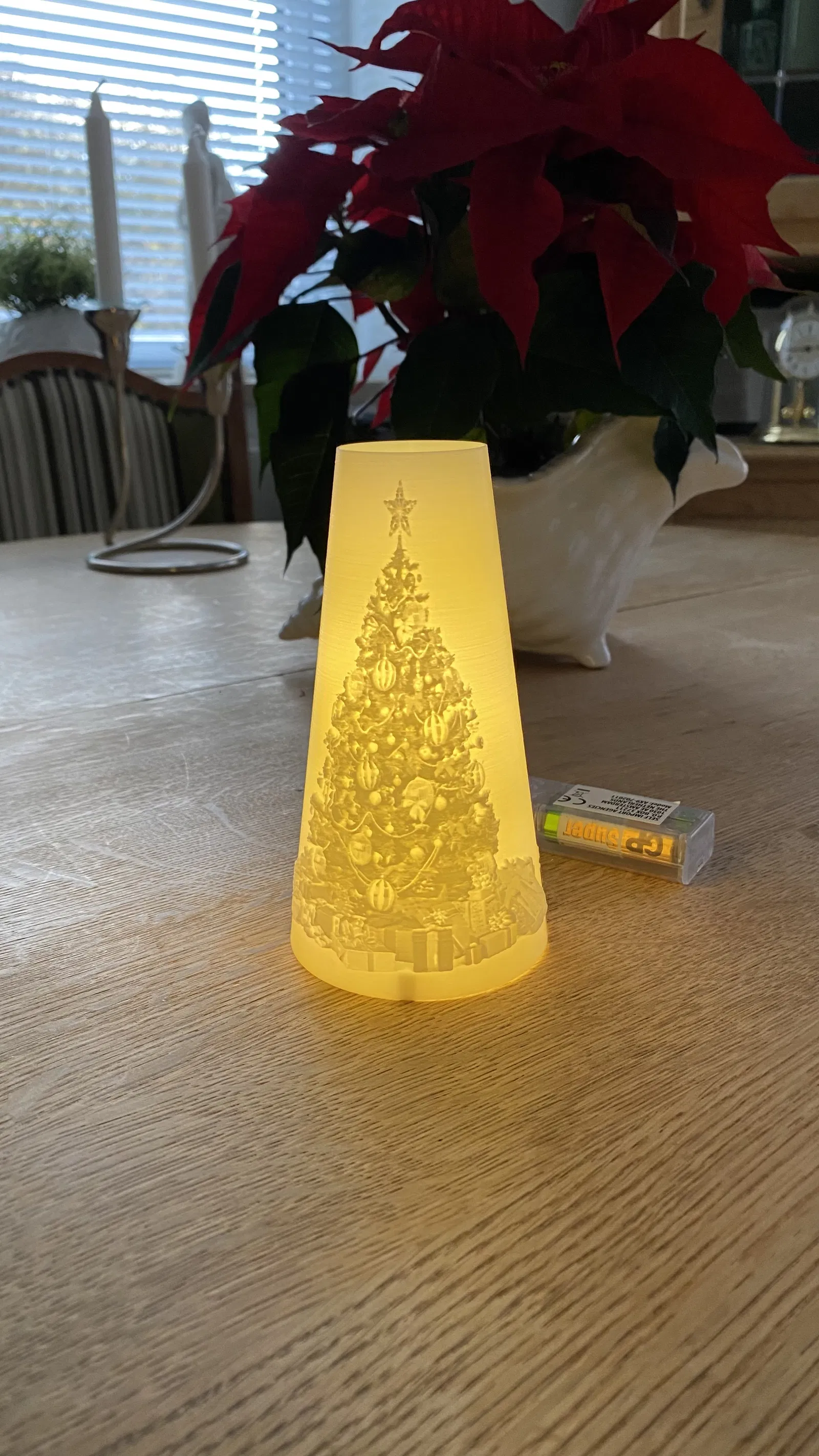 Mô hình cây thông Noel v³ với đèn Led, kích thước cao 150mm. Bản cập nhật thứ ba, sử dụng chất liệu PLA+ trắng với độ dày lớp in được tối ưu hóa. Thích hợp cho trang trí Giáng Sinh.