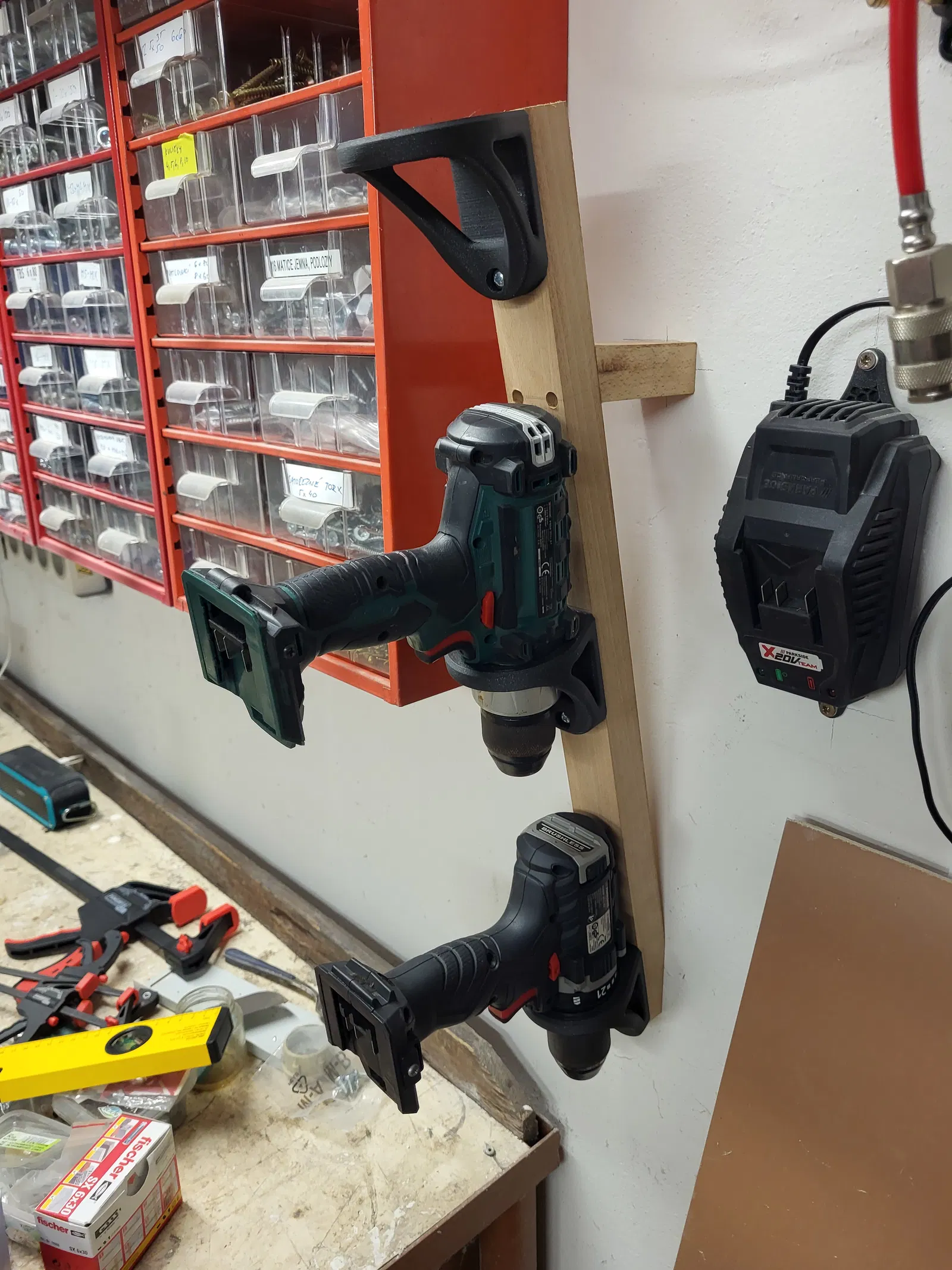 Giá đỡ máy khoan không dây, thích hợp treo tường. Đã thử nghiệm trên mẫu Parskide. Giải pháp lưu trữ gọn gàng cho không gian làm việc của bạn.