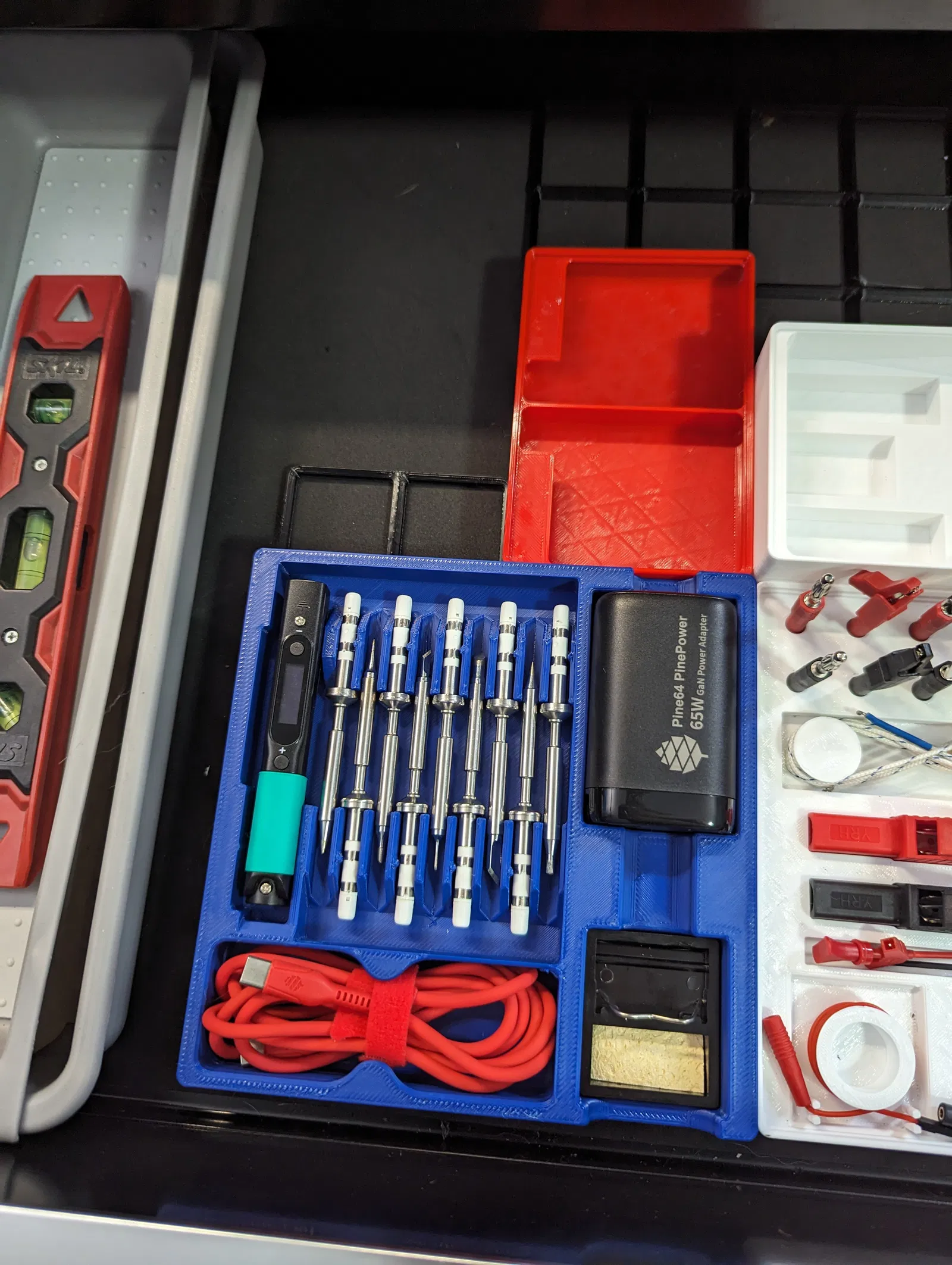 Lưu trữ bộ Pinecil của bạn cùng với các đồ Gridfinity khác (hoặc không!). Hộp đựng này cho phép bạn cất giữ mỏ hàn, đầu hàn đi kèm và thêm 8 đầu hàn nữa. Đã loại bỏ khe tua vít, thay bằng khe cho bộ nguồn và đế giữ mỏ hàn, đồng thời hỗ trợ Gridfinity.