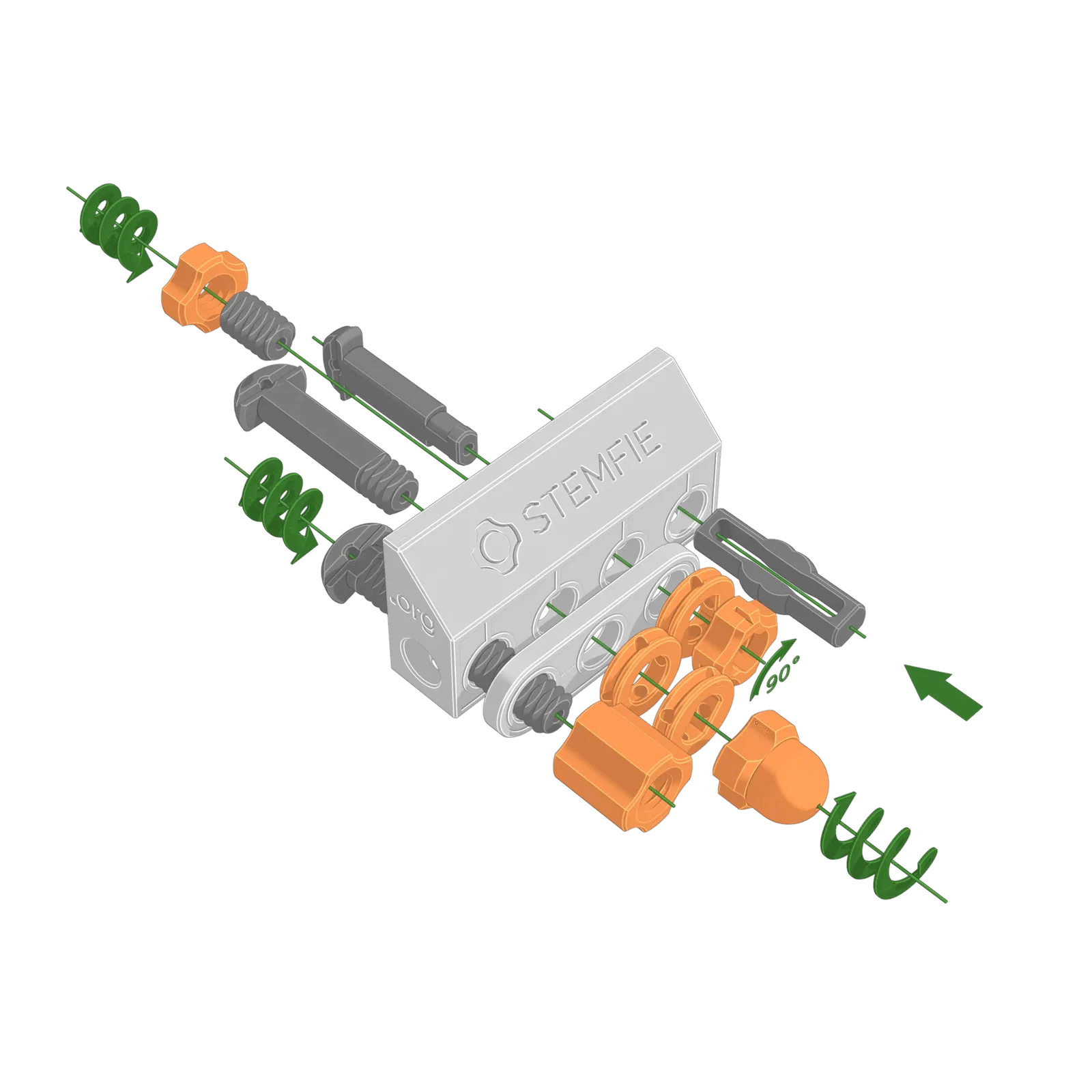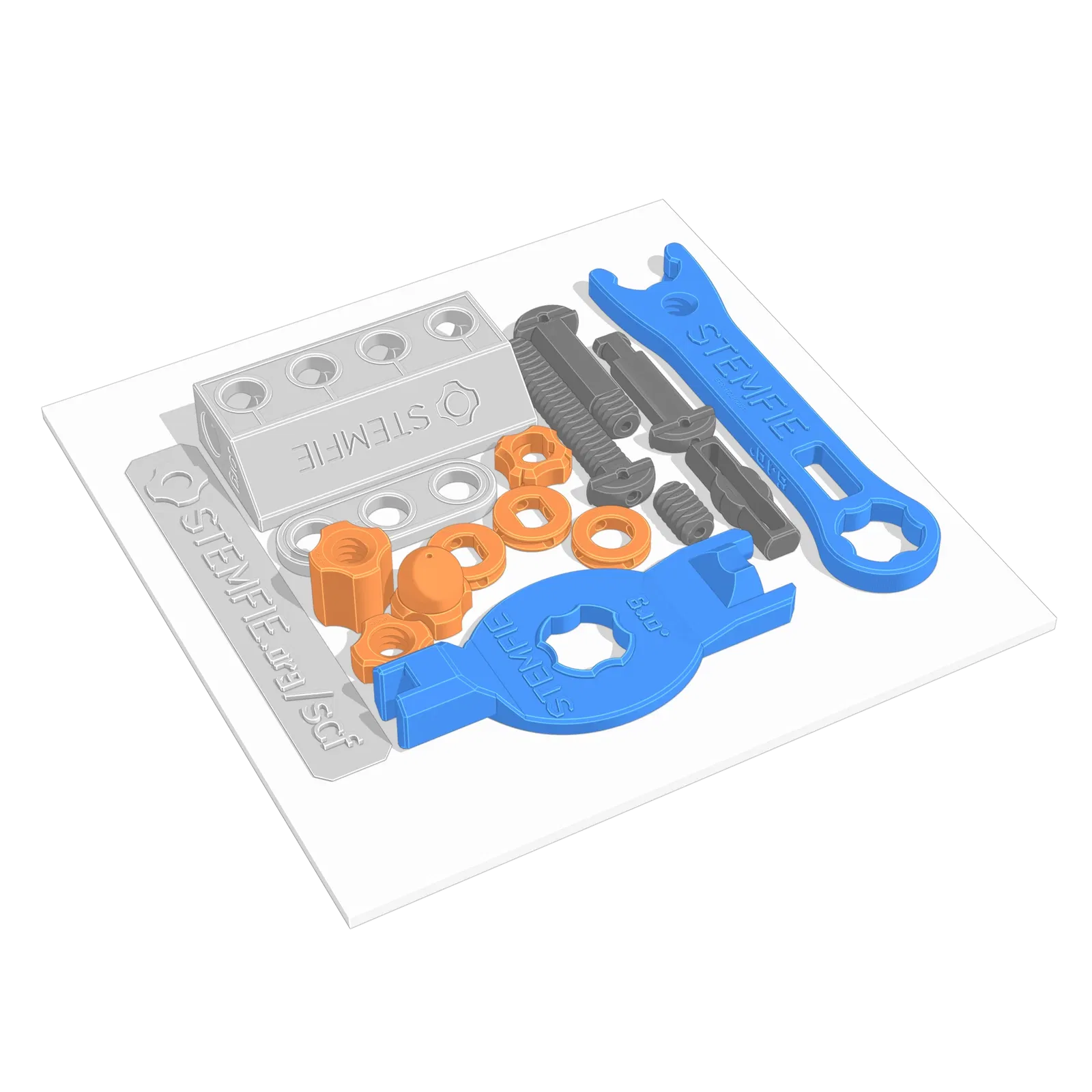 Bộ sưu tập các bộ phận STEMFIE này trình diễn nhiều loại ốc vít và công cụ đi kèm. Tất cả được lồng vào nhau trên một tấm xây dựng 104 x 88 mm, thời gian in khoảng 3 giờ và tiêu thụ 26g sợi nhựa.
