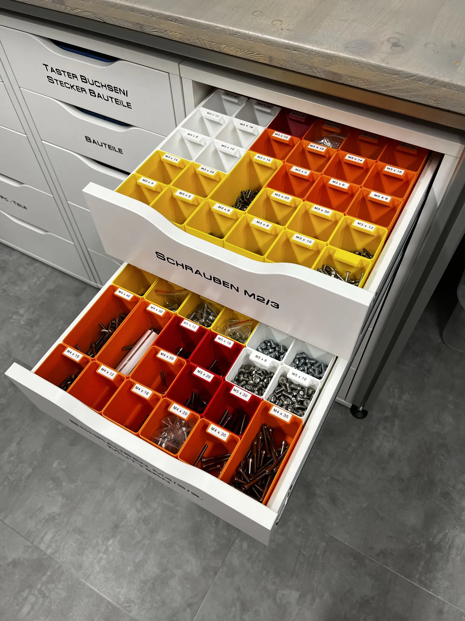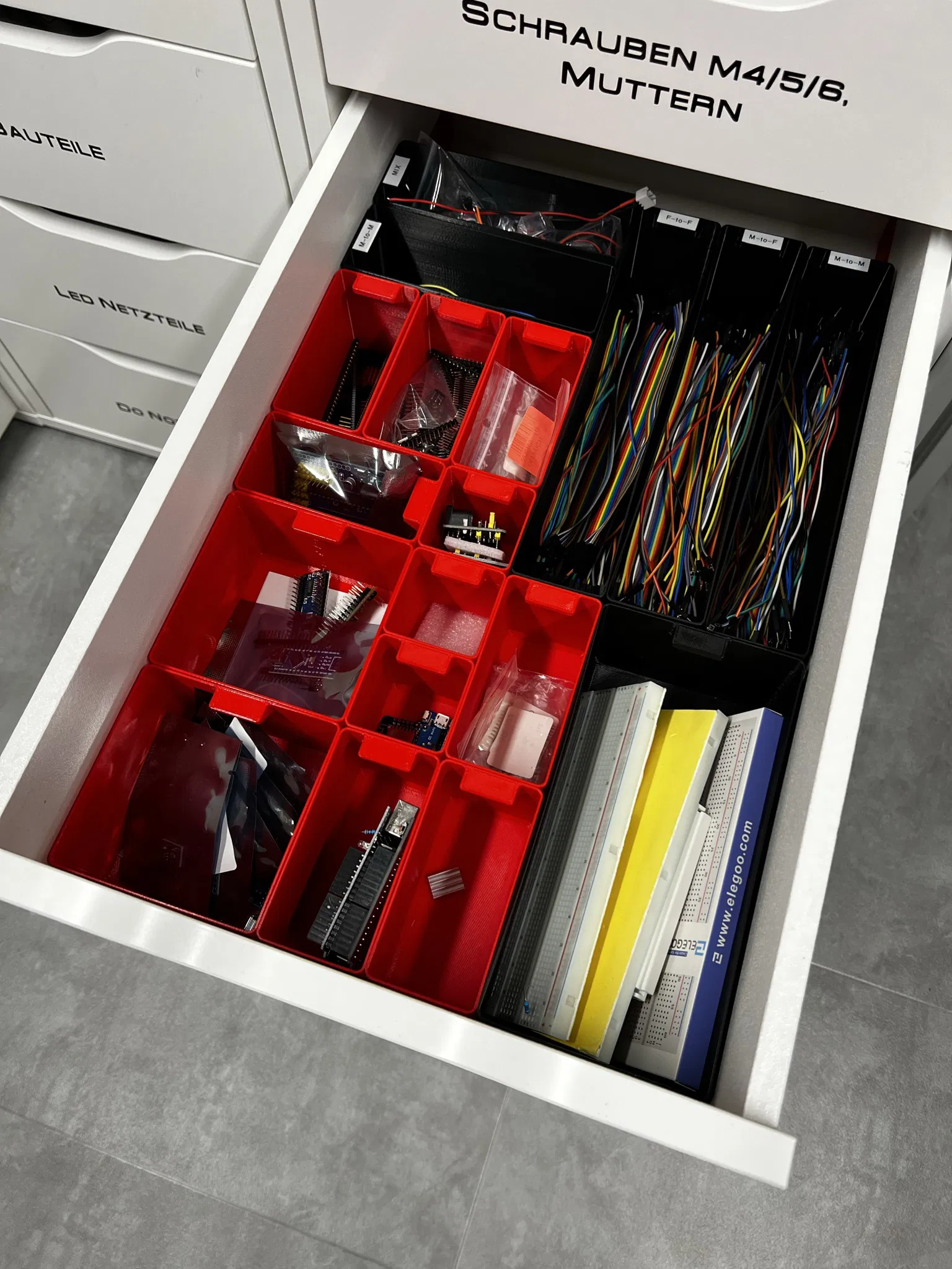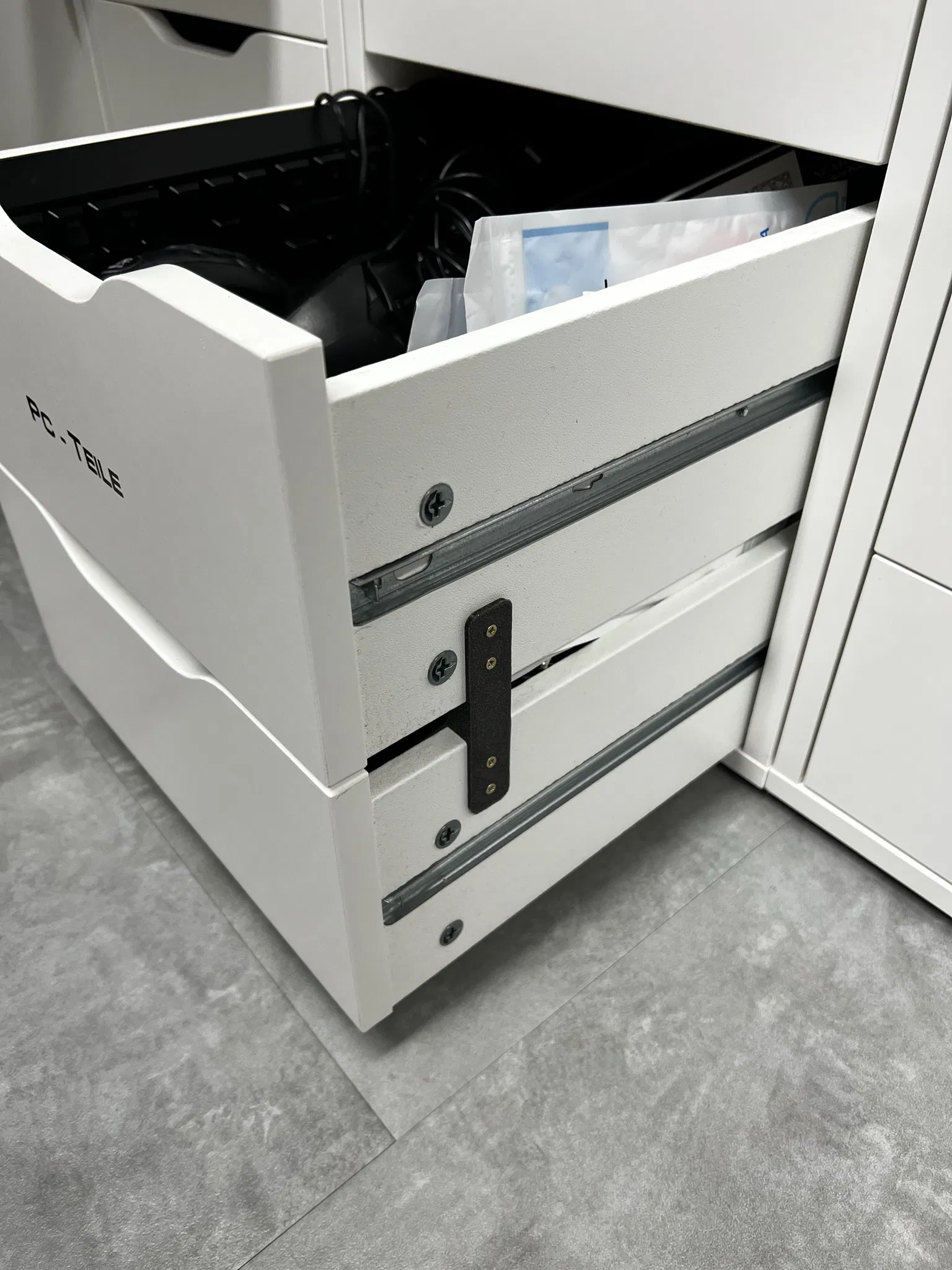 Đặt các phần chèn khác nhau cho một tủ văn phòng IKEA Alex & Malm.