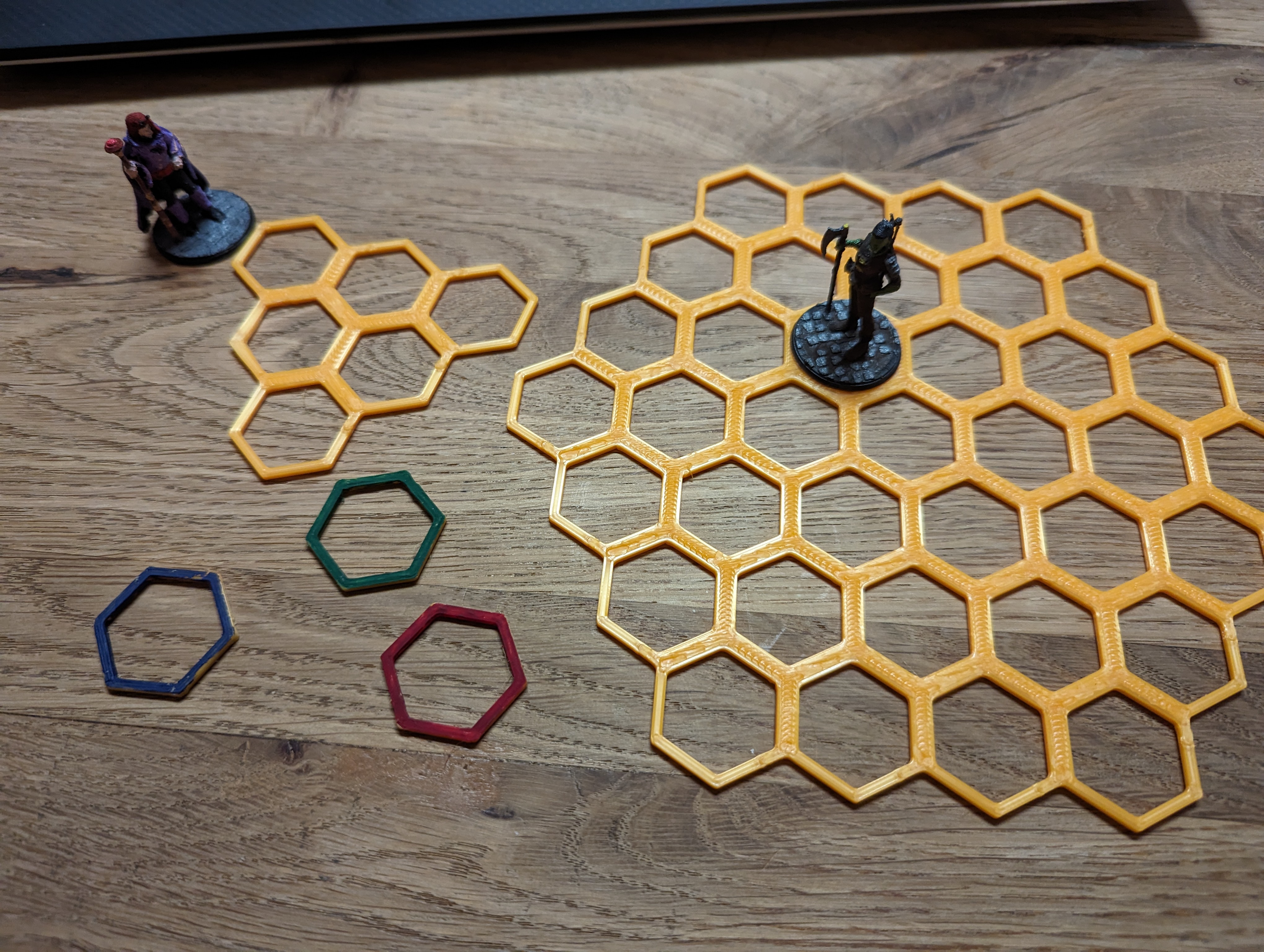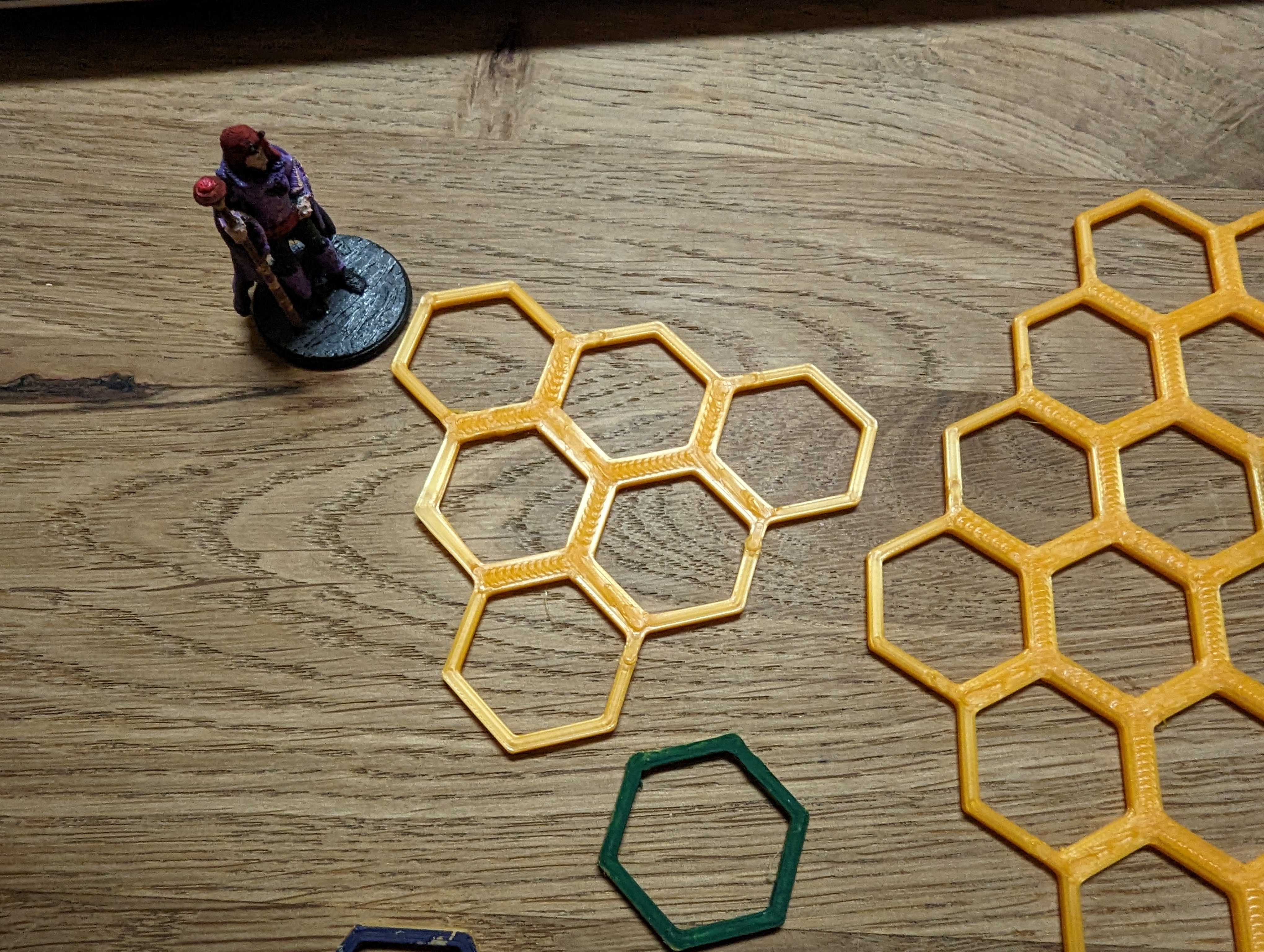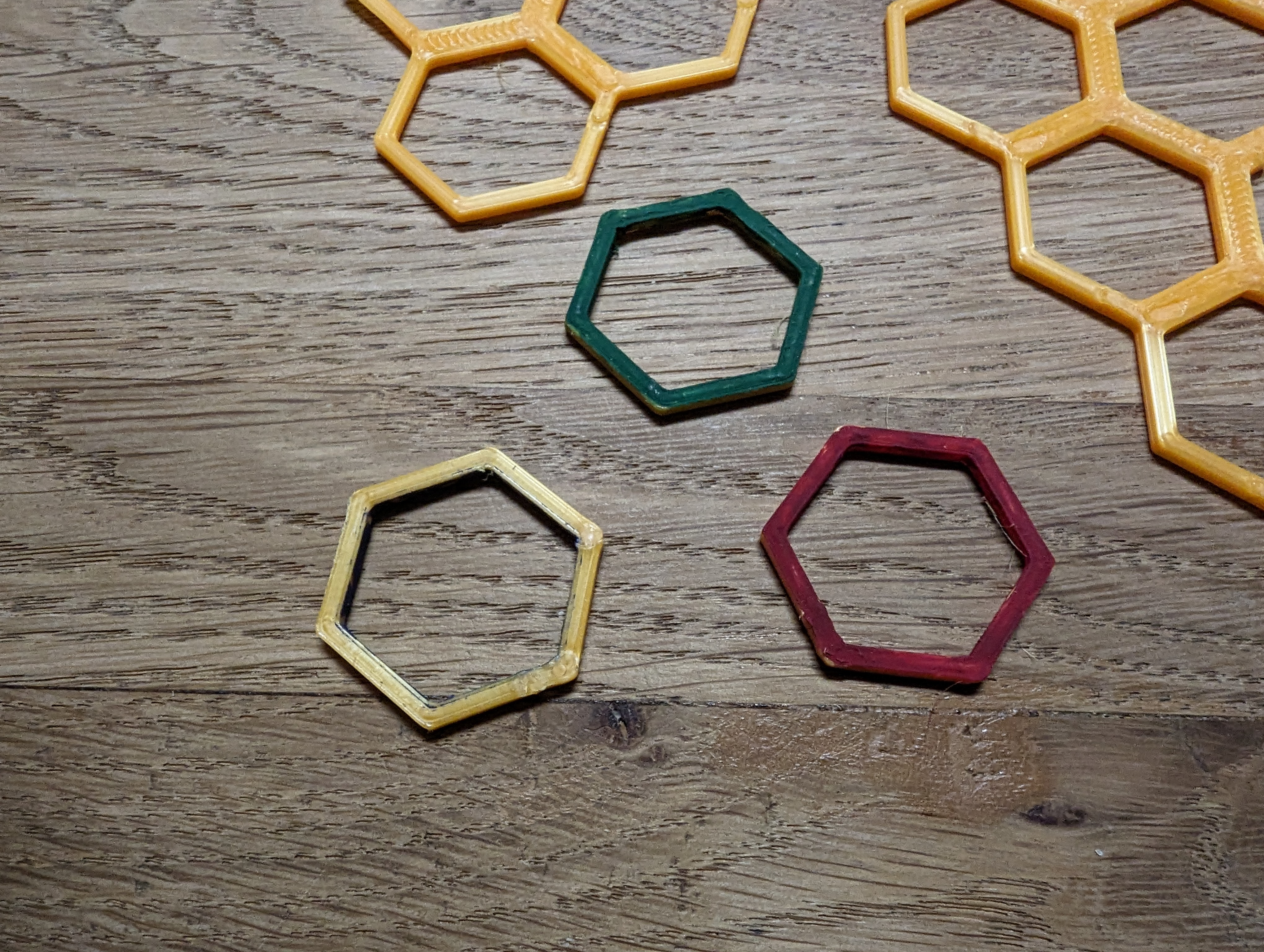 Mình đã in hết tất cả, và một nắm các hình lục giác đơn lẻ, để đánh dấu một số vị trí hoặc hiệu ứng khi cần. Mình đã sơn một mặt của các bộ phận đơn lẻ, nên khi lật chúng lại có thể bật hoặc tắt hiệu ứng.
