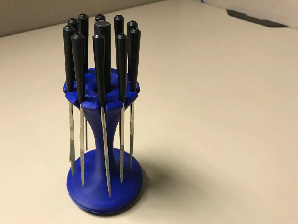 Tôi có bộ 10 cái giũa kim cương mini của Harbor Freight, và nó đi kèm với một cái đế nhựa rẻ tiền, tạm được nhưng không ngon lắm. Tôi quyết định làm cho nó "chanh sả" hơn một chút và in ra một cái đế, rồi còn "chất chơi" hơn nữa là thiết kế nó hoạt động như kiểu "lazy susan" để xoay được.