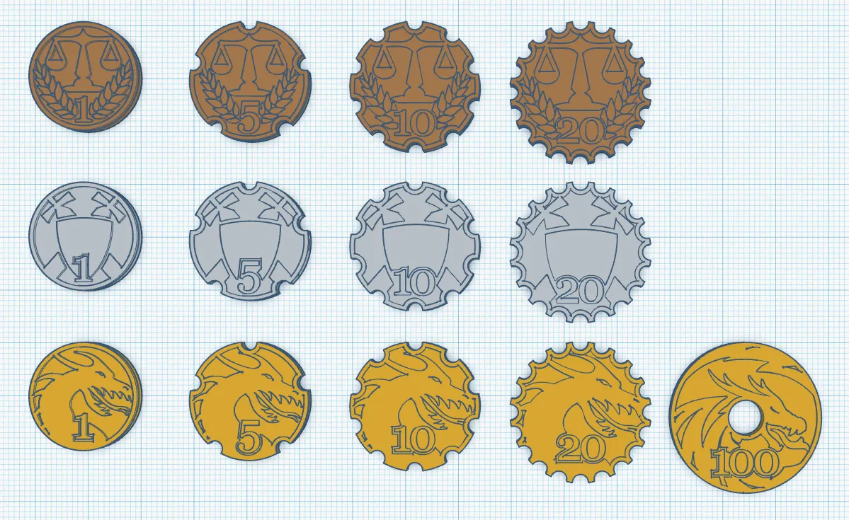 Phần đế của mấy đồng xu tui thiết kế để nó lớn dần theo mệnh giá. Thiết kế mỗi loại kim loại (đồng, bạc, vàng) là khác nhau. Càng lên mệnh giá cao, thì số khía trên đồng xu càng khớp với giá trị. Chỉ có cái đồng 100gp là có cái lỗ ở giữa để phân biệt thôi.
