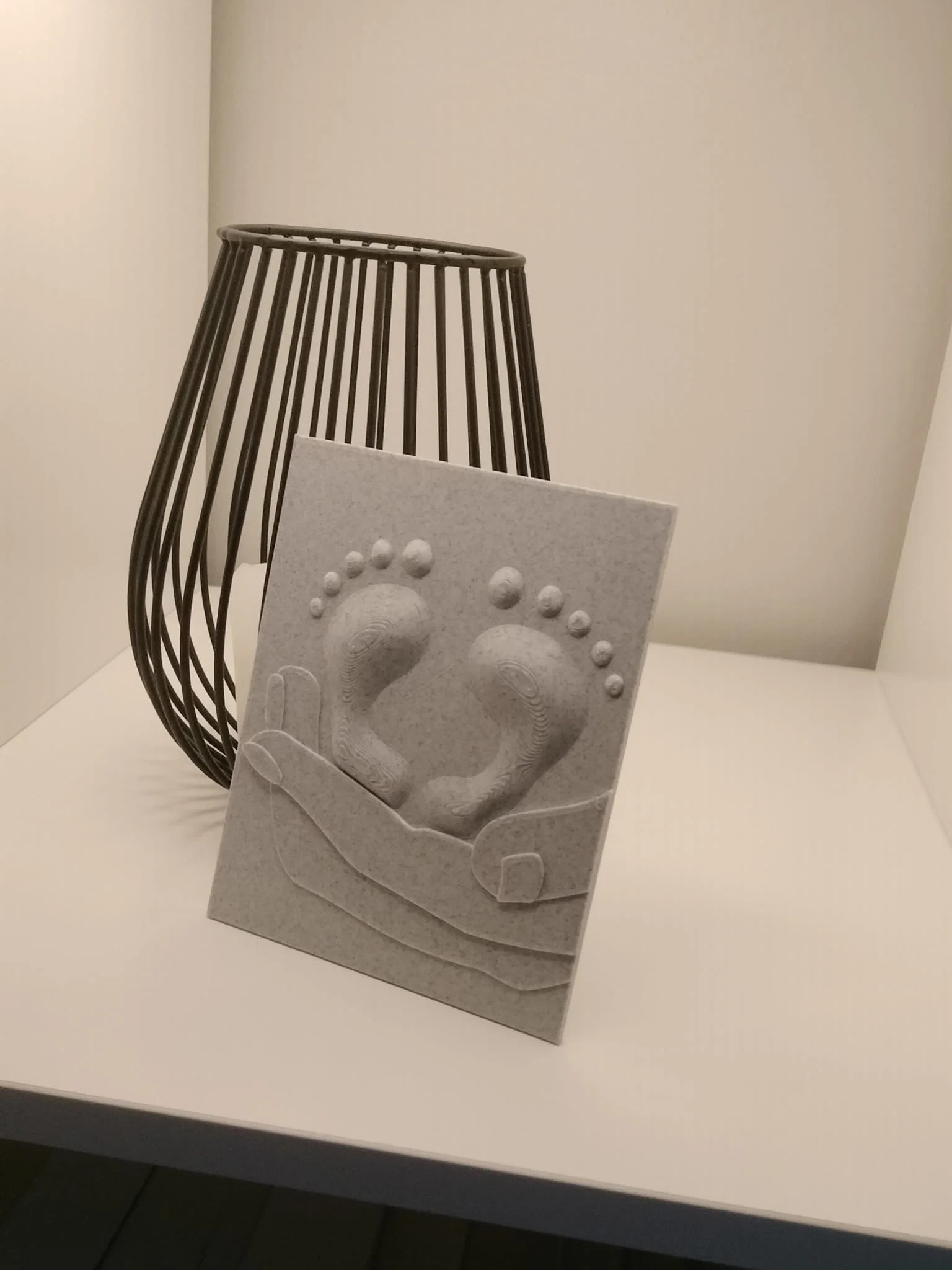 Mô hình trong ảnh là Babyfeet small.stl, là file stl kia được thu nhỏ lại 55% và in bằng sợi Marble Grey Prusament PLA. Đế đỡ đi kèm được thiết kế cho phiên bản nhỏ, nhưng bạn cũng có thể phóng to nó lên kích thước lớn hơn mà không gặp vấn đề gì.
