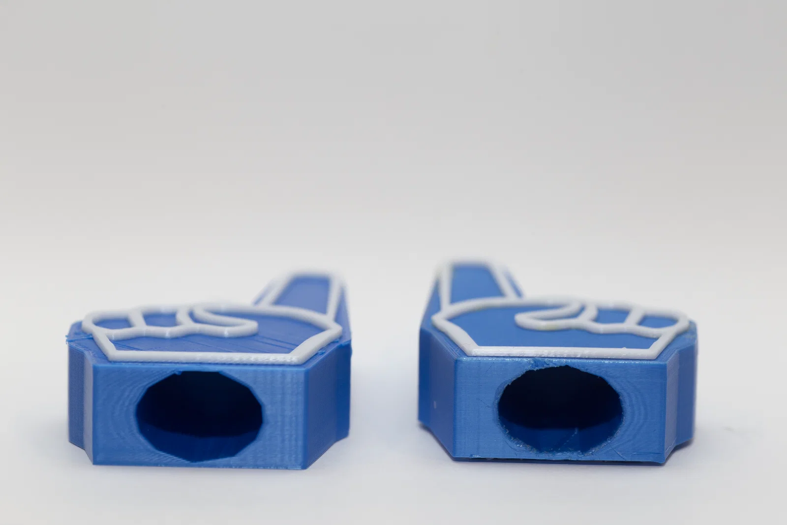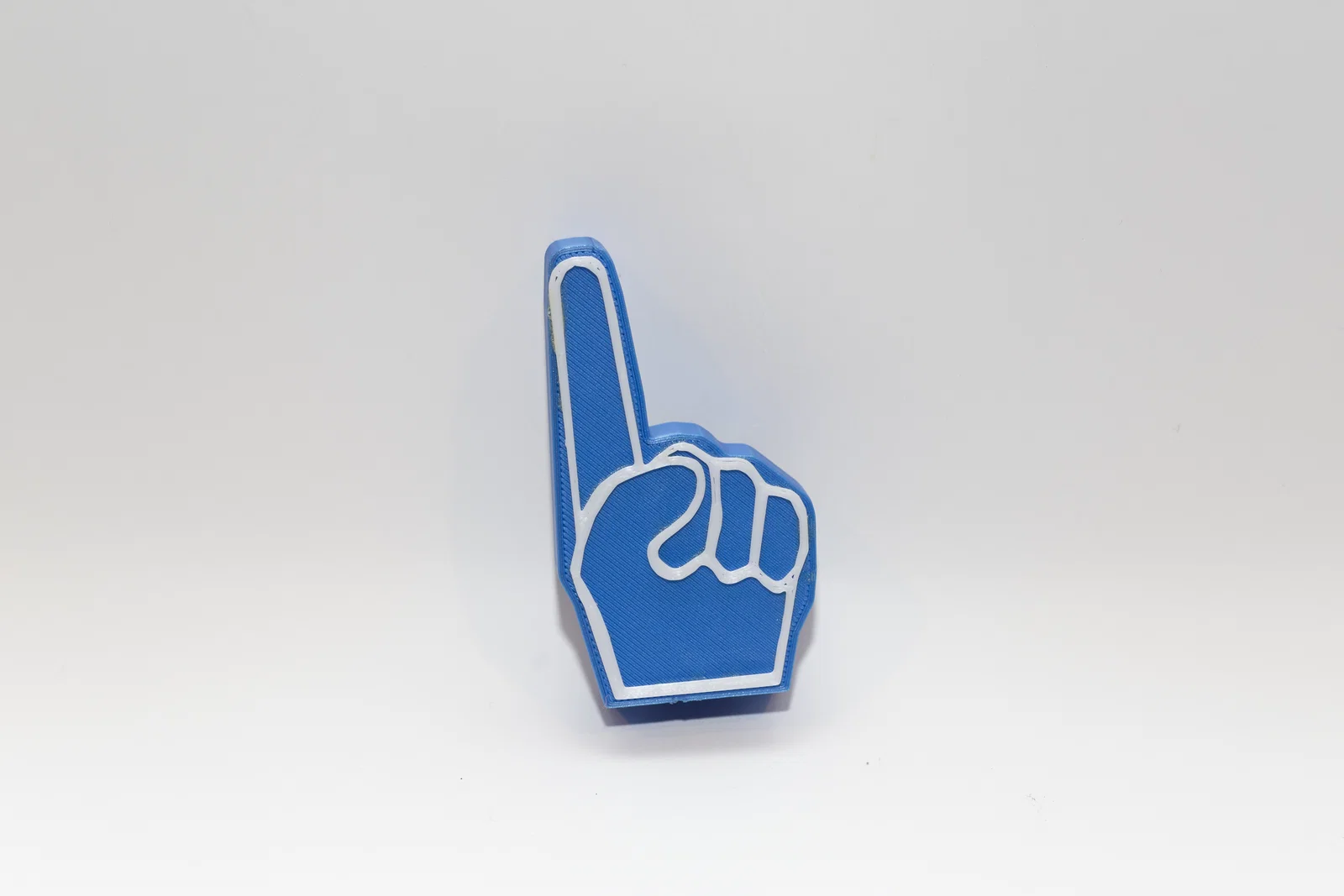 Mẫu đồ chơi mini hình bàn tay cổ vũ màu xanh dương, có thể đeo vào ngón tay. In 30% infill không cần supports là được, còn nếu dùng supports thì sẽ khó gỡ.