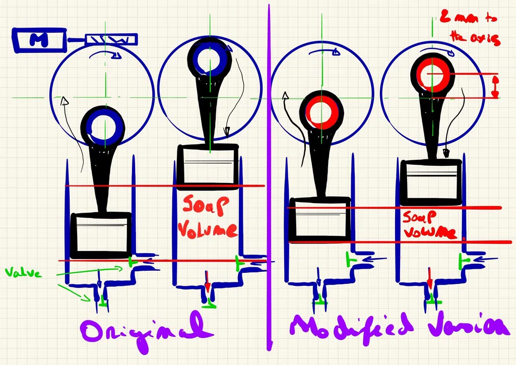 Trên 8 thiết bị đã sửa đổi, tôi đã gặp sự cố khi thử nghiệm bằng nguồn điện, bộ phận bằng nhựa resin không đủ chắc chắn và trục bánh răng bị gãy, triệu chứng là cho ra hai hoặc ba liều xà phòng thay vì một, trên thực tế là công tắc vi mạch vẫn được kích hoạt (hoặc không), trong mọi trường hợp nó không còn được kích hoạt bởi cam nữa vì nó đã bị hỏng.