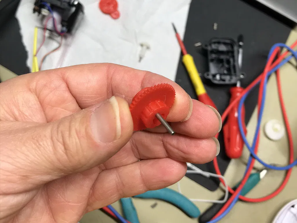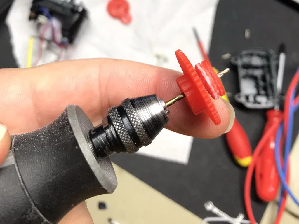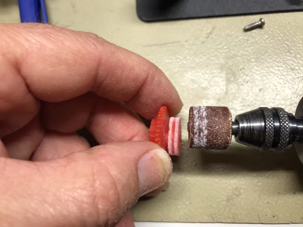 Cam phải được đánh bóng bằng giấy nhám để loại bỏ mọi dấu vết hỗ trợ (ảnh), trục phải được khoan lại bằng máy Dremel để trục nhỏ ban đầu có thể lắp vào lỗ trục rất dễ dàng.