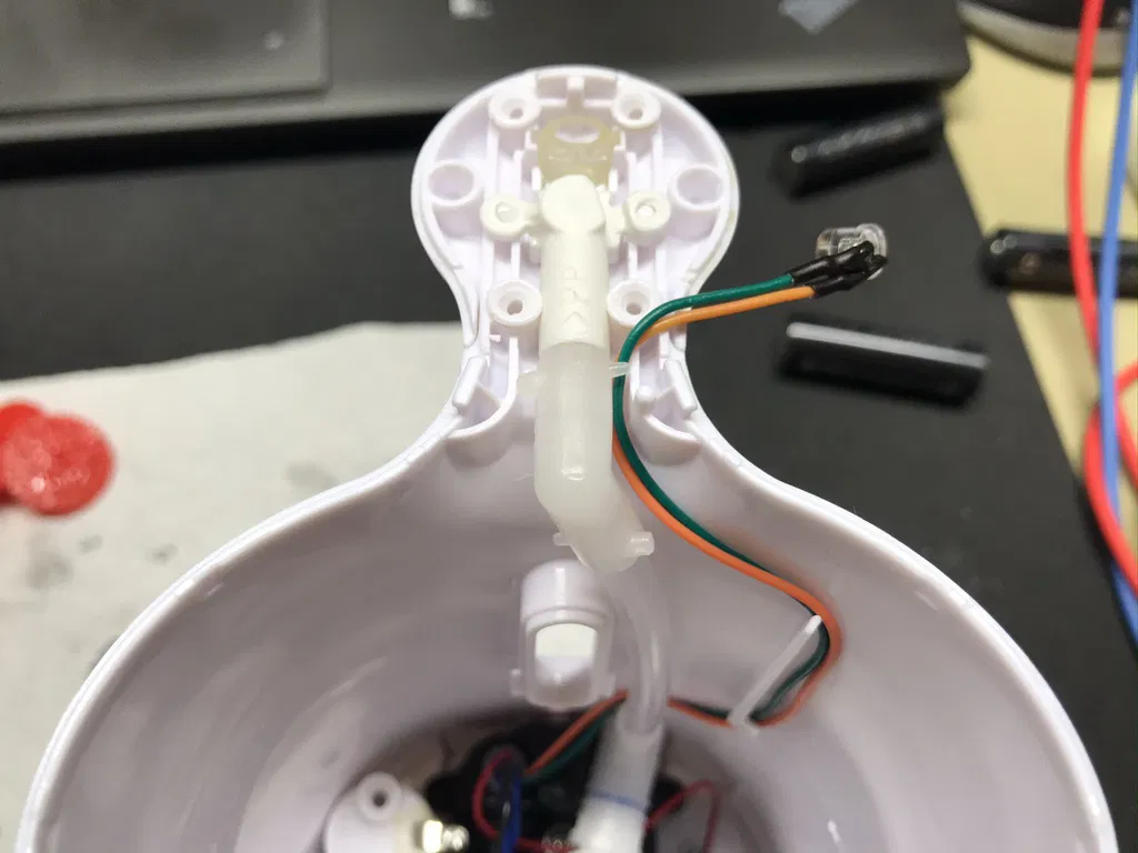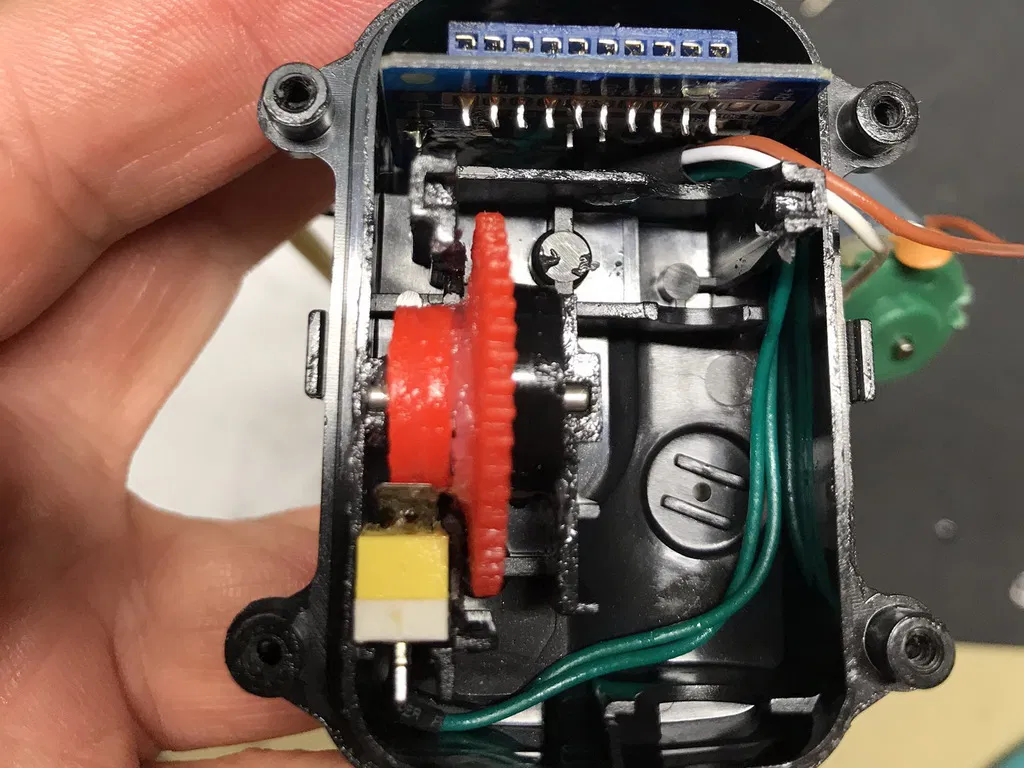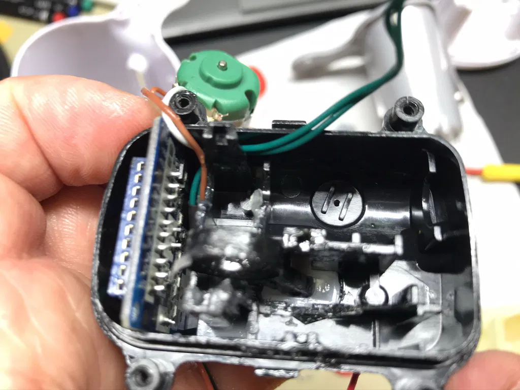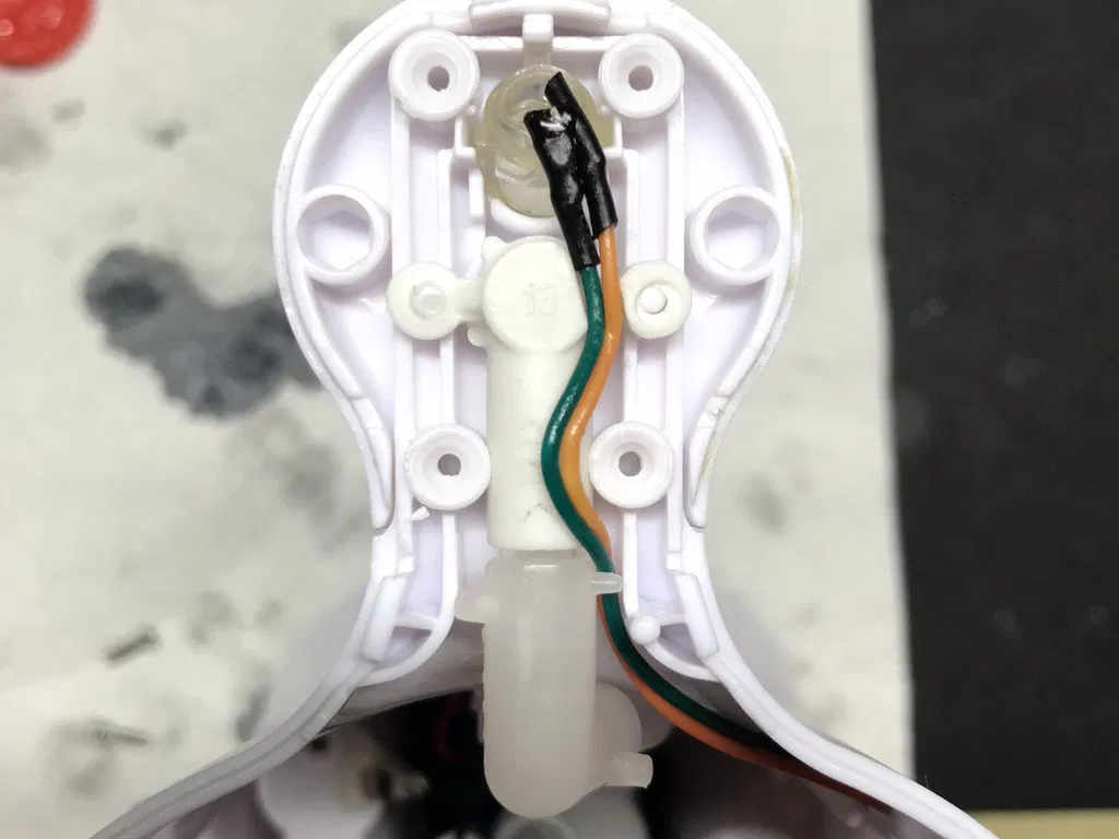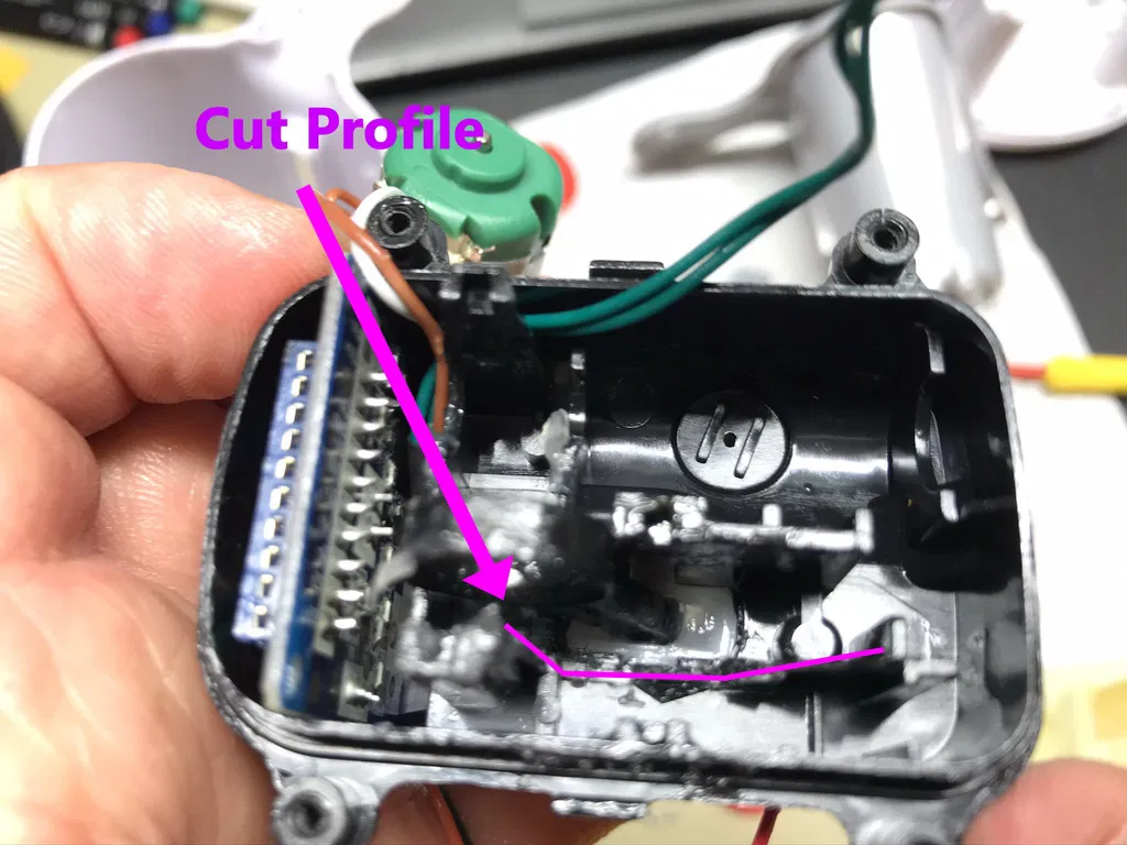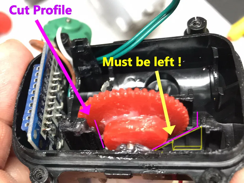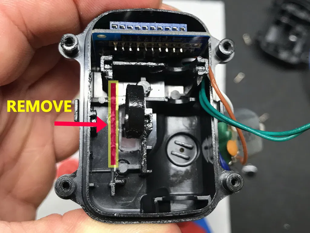 Bơm phải được sửa đổi để loại bỏ tấm trung gian (hình chữ nhật đỏ/vàng theo ảnh), điều quan trọng là phải giữ lại lượng nhựa cần thiết để giữ vi mạch công tắc đúng cách, để làm điều này, tấm phải được cắt ở góc 45° tại điểm này theo đường viền màu tím trên ảnh.