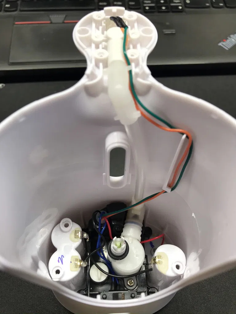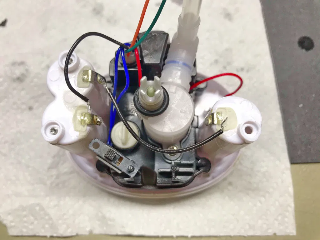 Việc lắp lại phải dễ dàng: đặt bộ phận bơm trở lại vị trí, hàn dây, đảm bảo định vị lại công tắc nhỏ và nắp nhựa của nó.