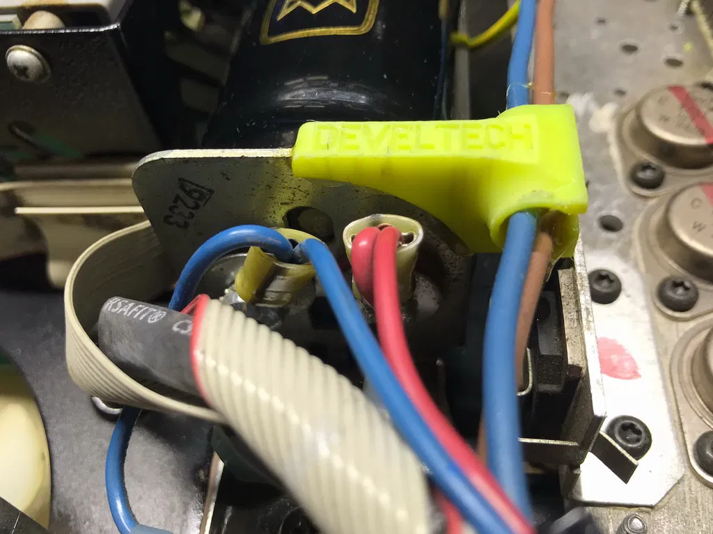 Trên nhiều cục ampli mà tôi đã sửa chữa, một số cục bị hỏng dây cáp nguồn chính do cọ xát vào giá đỡ của tụ điện dung lớn. Vì vậy, tôi đã tạo ra một bộ phận nhỏ để giữ chặt dây cáp.