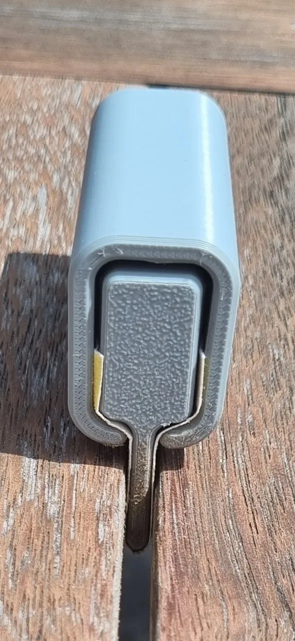 Mấy cái rãnh ở cục bên trong là để giấy nhám nó hông có bị trượt. Cục bên ngoài thì tui làm nhỏ hơn một chút để nó siết vô, khỏi cần ốc hay cái kẹp gì cho dễ gãy.