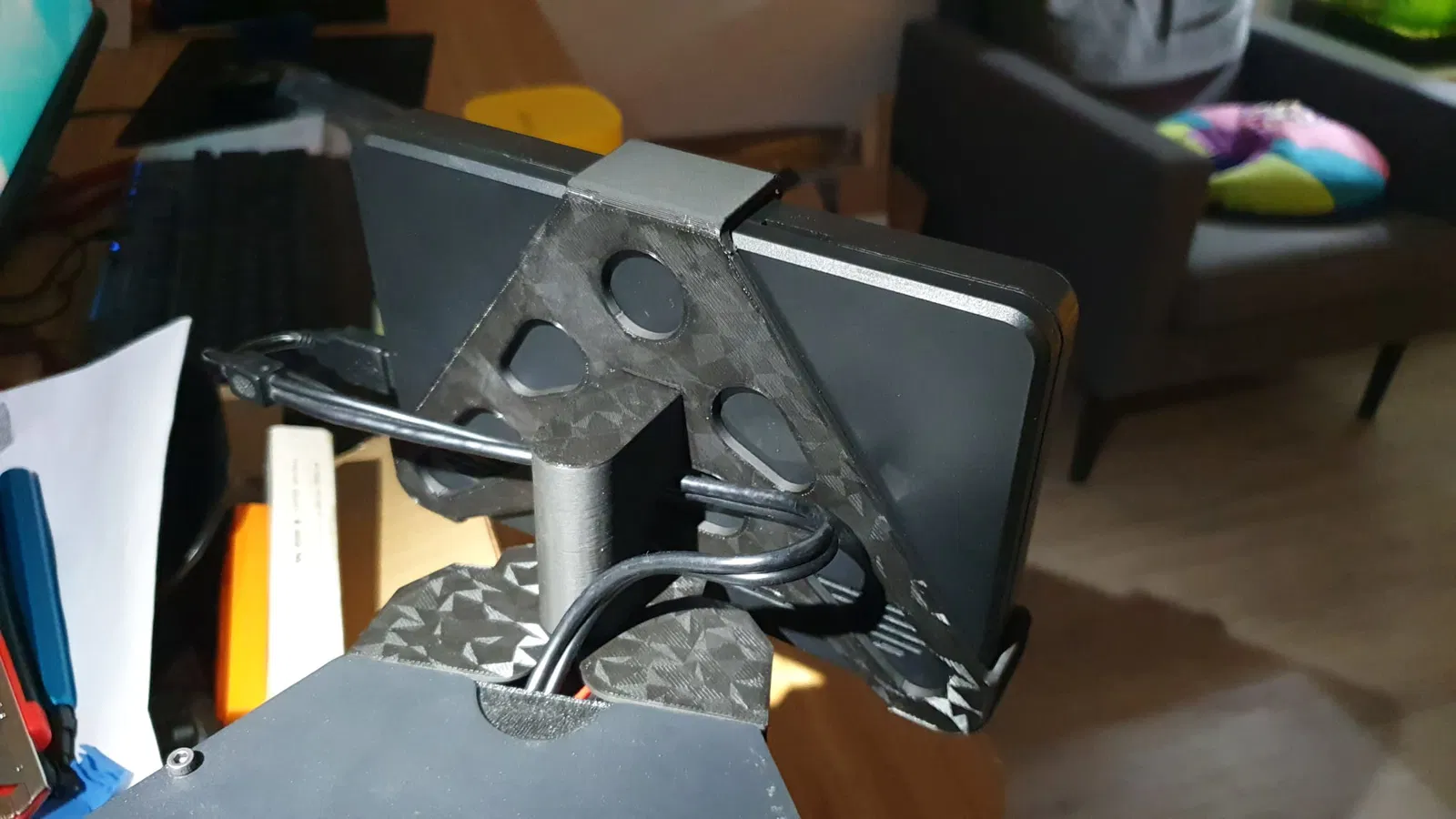 Tao không ưng mấy mẫu có sẵn nên tự chế cái giá đỡ Pad FLSUN V400, đặt trên thanh profile khung máy và chỉnh được góc. Sử dụng lại thiết kế Pad Holder có sẵn, in bằng PLA, 15% Gyroid infill, 0.2mm layer height, không cần support.