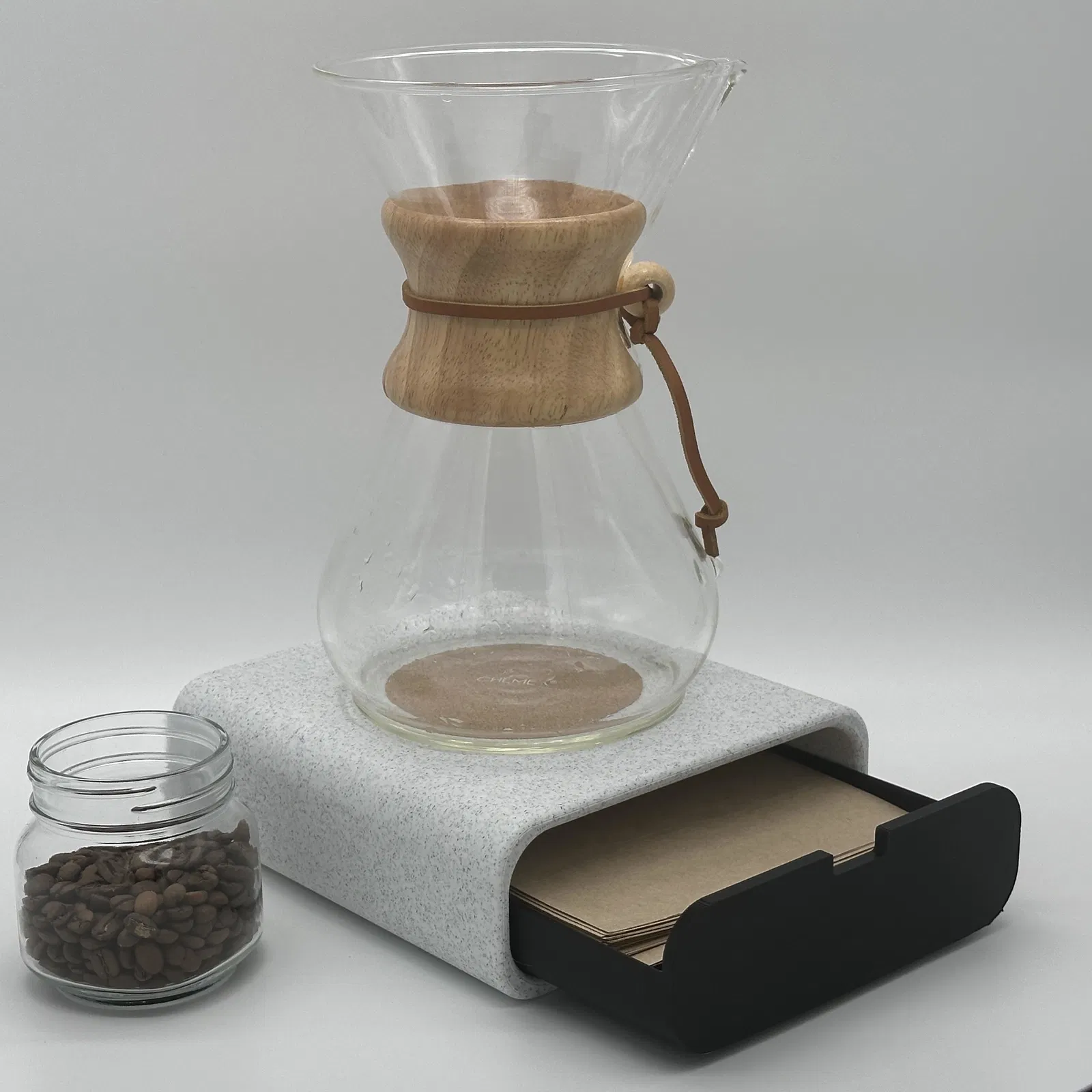 Giữ cho bộ lọc pour over của bạn luôn gọn gàng với Bộ Tổ Chức Chemex này. Hình ảnh là một bình Chemex 8 cup. Nên in bằng sợi nhựa chịu nhiệt cao hoặc sử dụng đế lót bần dán vào để tránh bị cong vênh.