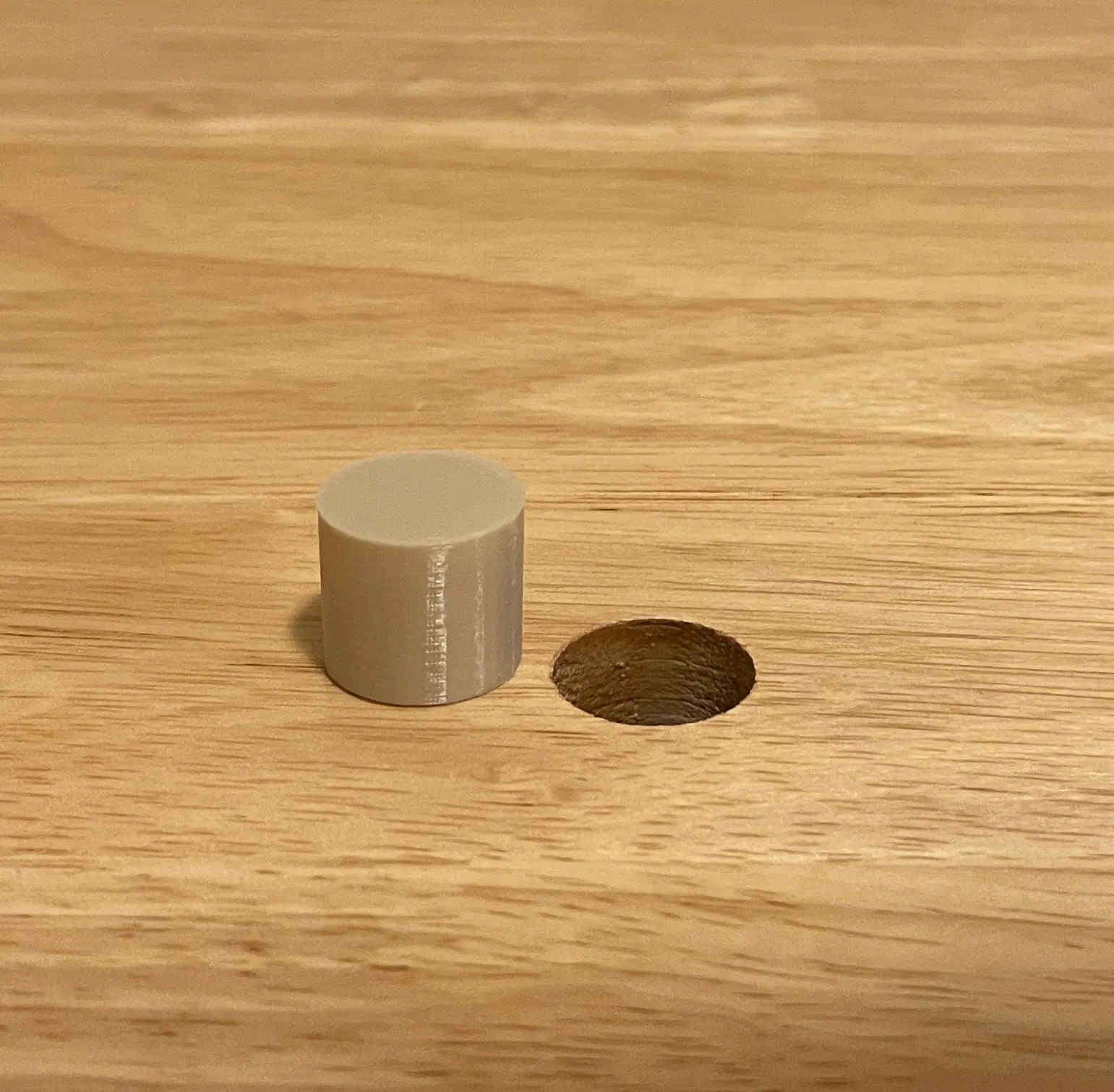 Tui mua bàn làm việc gỗ cứng Harbor Freight Yukon 60in mà hổng thích mấy cái lỗ treo đồ nghề của nó. Tui thiết kế mấy cái nút bịt này để khắc phục, in bằng PLA+ nè. Có côn nên siết chặt vô lỗ, không bị lọt qua. Đầu in trên bàn in là đầu hướng lên bàn làm việc.