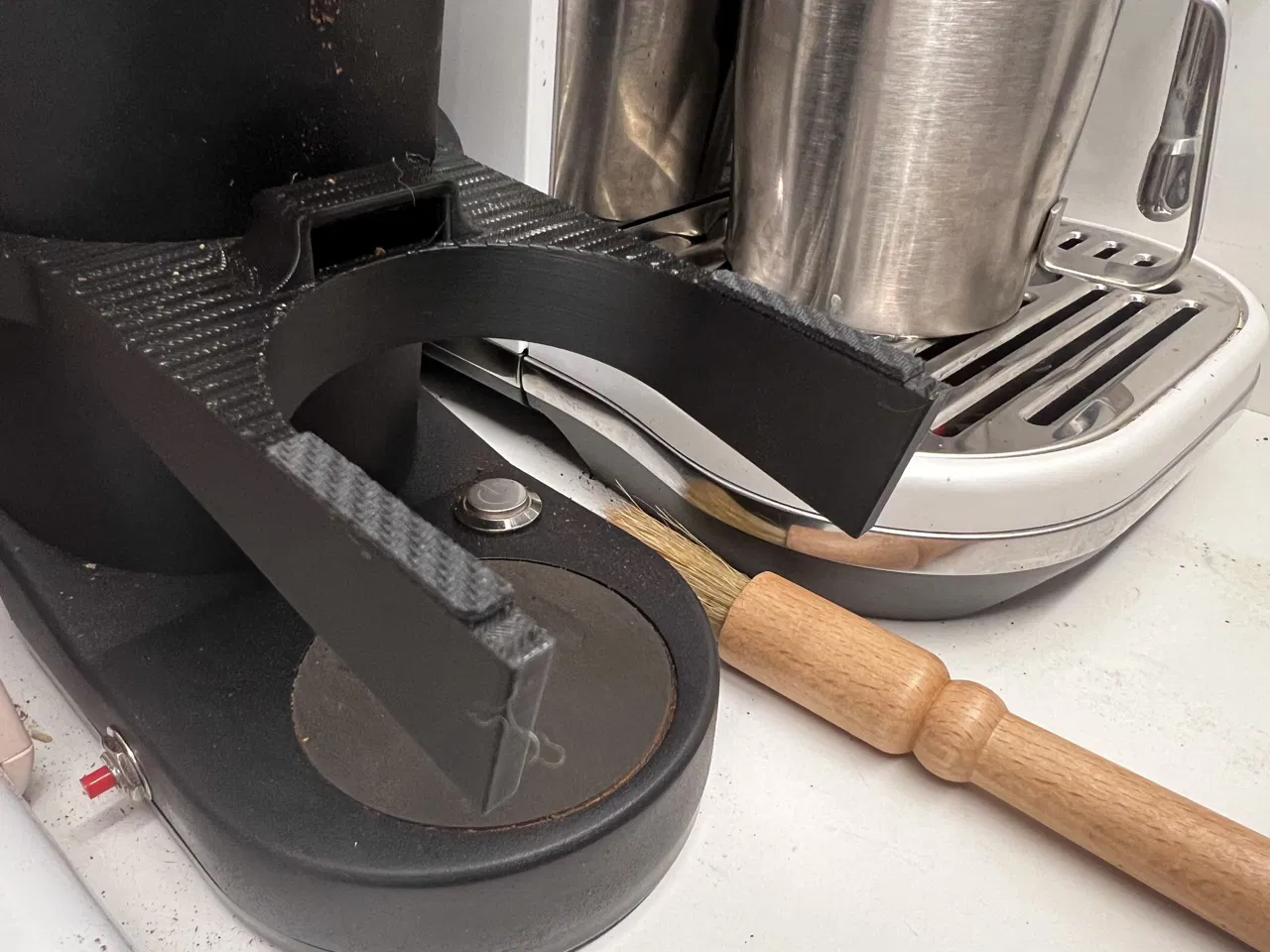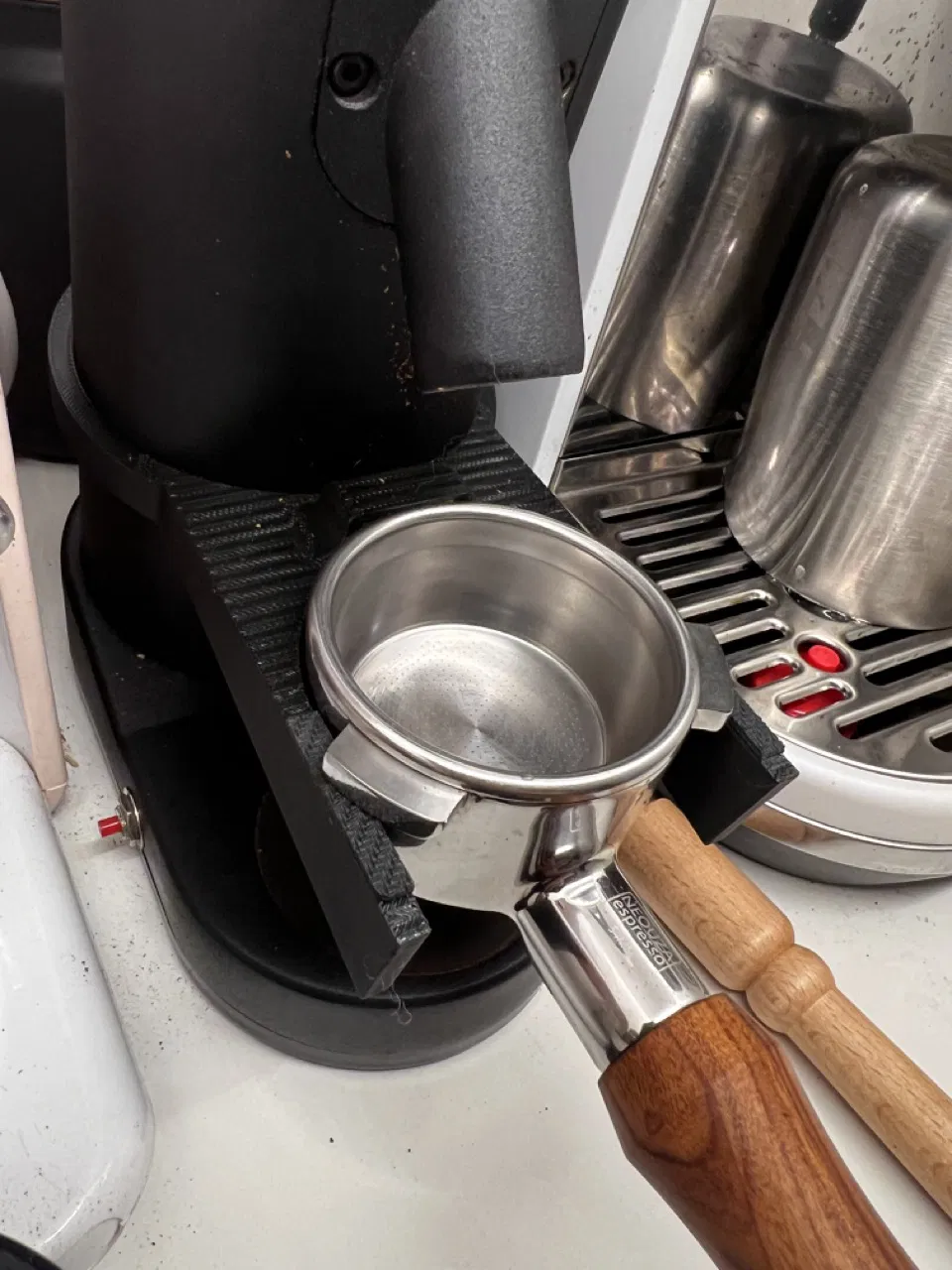 Vì vậy, tôi đã thiết kế một bộ giữ tay cầm (portafilter holder) 53/54mm kiểu "slip-on+clamp" nhanh gọn, cho phép bạn điều chỉnh theo chiều cao của phễu và khoảng cách với máy xay. Sử dụng ốc M3 để cố định chặt vào máy xay và một số miếng đệm chống trượt để tay cầm không bị rung lắc khi xay.