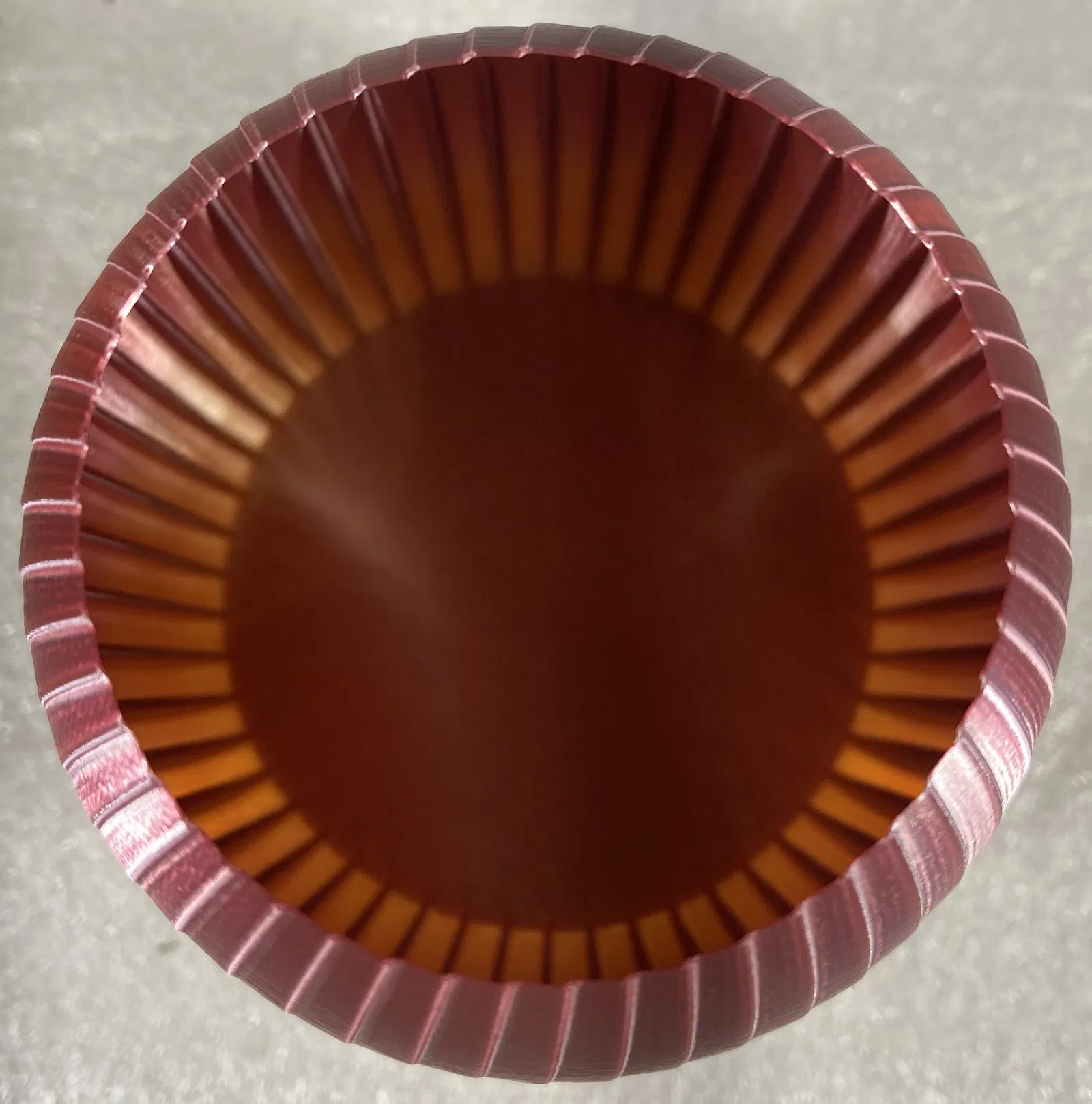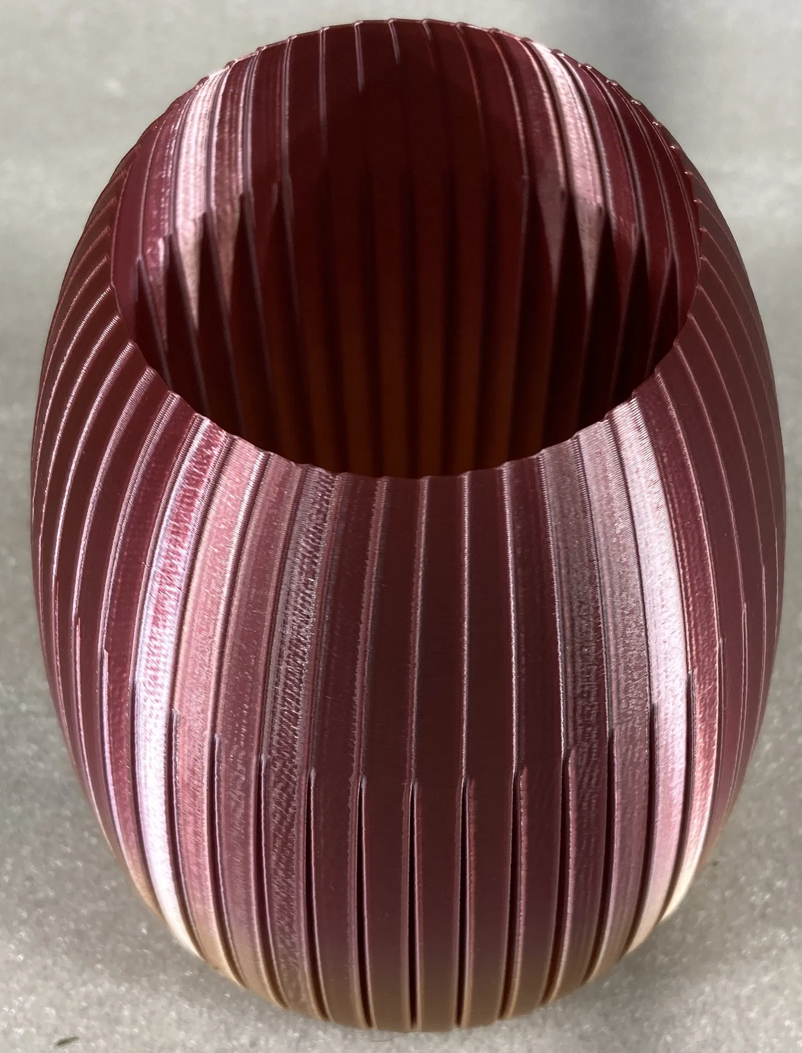 Cái bình này có đường cong mềm mại từ trên xuống dưới, xen kẽ bởi những đường cắt dọc mỏng. Mình in bằng PLA lụa GNVTNTP.