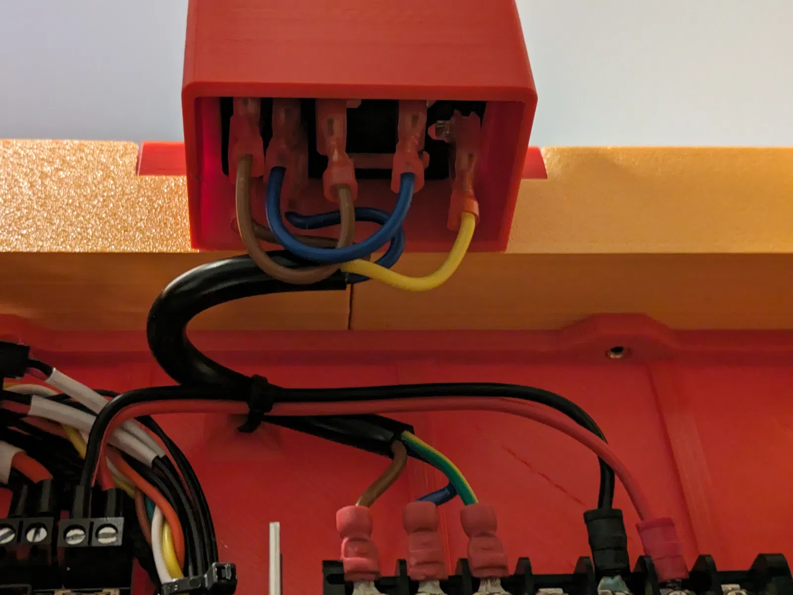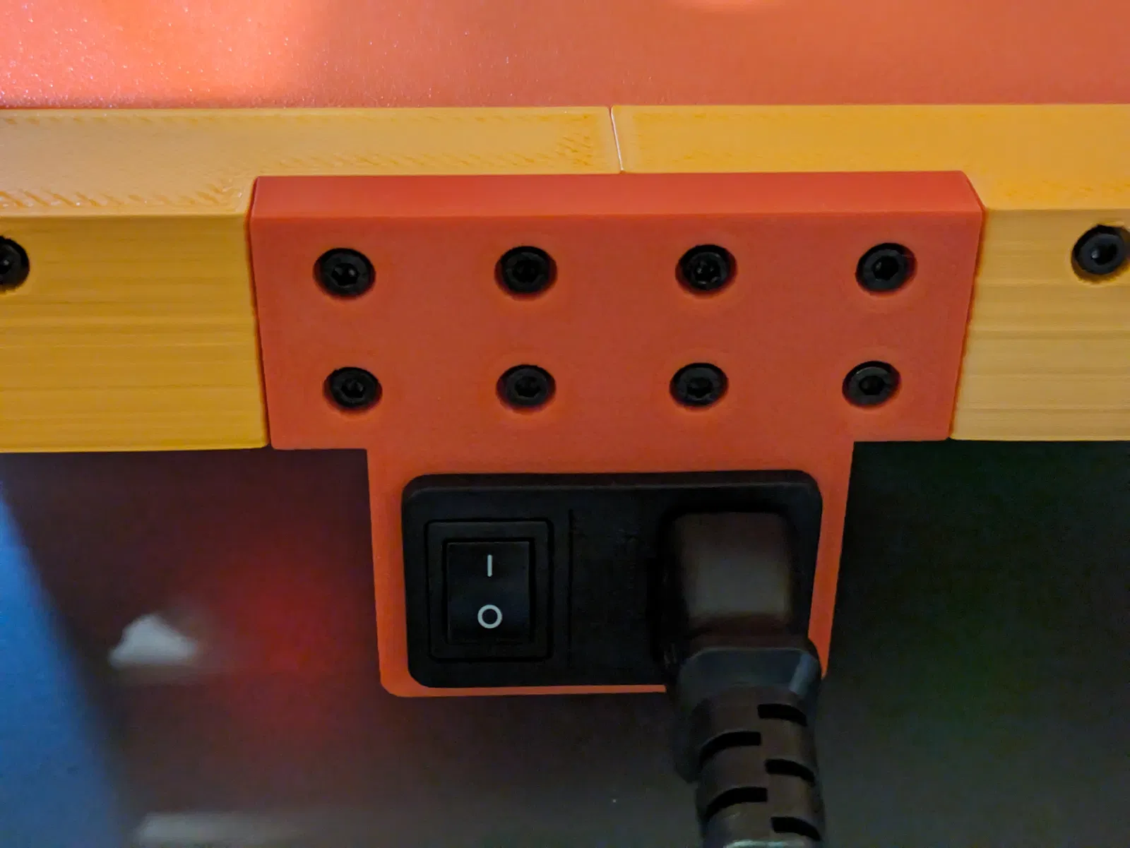 Các cạnh của vỏ được kéo dài vào bên trong máy in để tránh tiếp xúc ngẫu nhiên với dây điện. Mặt sau của vỏ được để trống để dễ dàng tiếp cận các điểm nối khi đi dây.