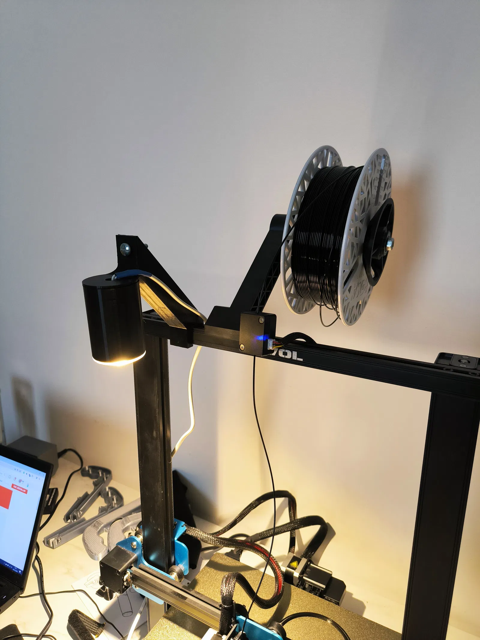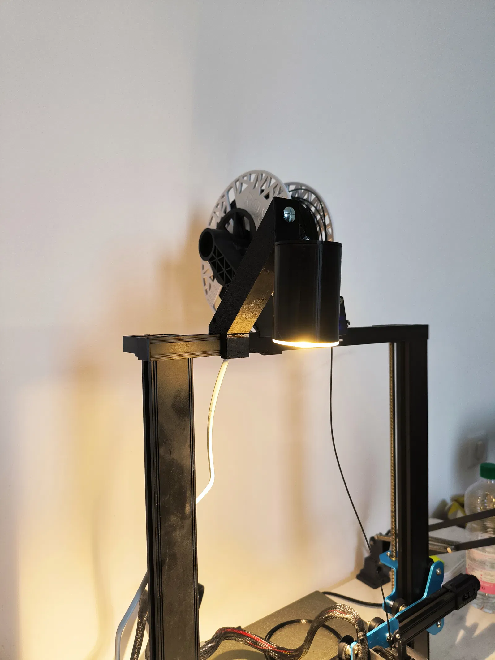 Thiết kế một bộ phận đỡ để đặt bóng đèn GU10 lên khu vực in. Các bộ phận có thể in mà không cần hỗ trợ. Ray đỡ và ống giữ gắn bằng vít M5. Lưu ý về kích thước bóng đèn và khả năng gộp chung với giá đỡ cuộn dây.
