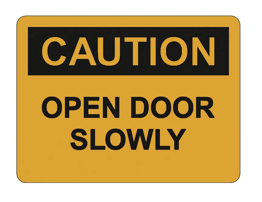 Một tấm biển báo đơn giản với thông điệp "Mở cửa chậm". Thích hợp để nhắc nhở mọi người cẩn thận khi ra vào cửa, đặc biệt ở những nơi đông người qua lại hoặc có trẻ nhỏ. Dễ dàng in ấn với PLA hoặc các vật liệu phổ biến khác.