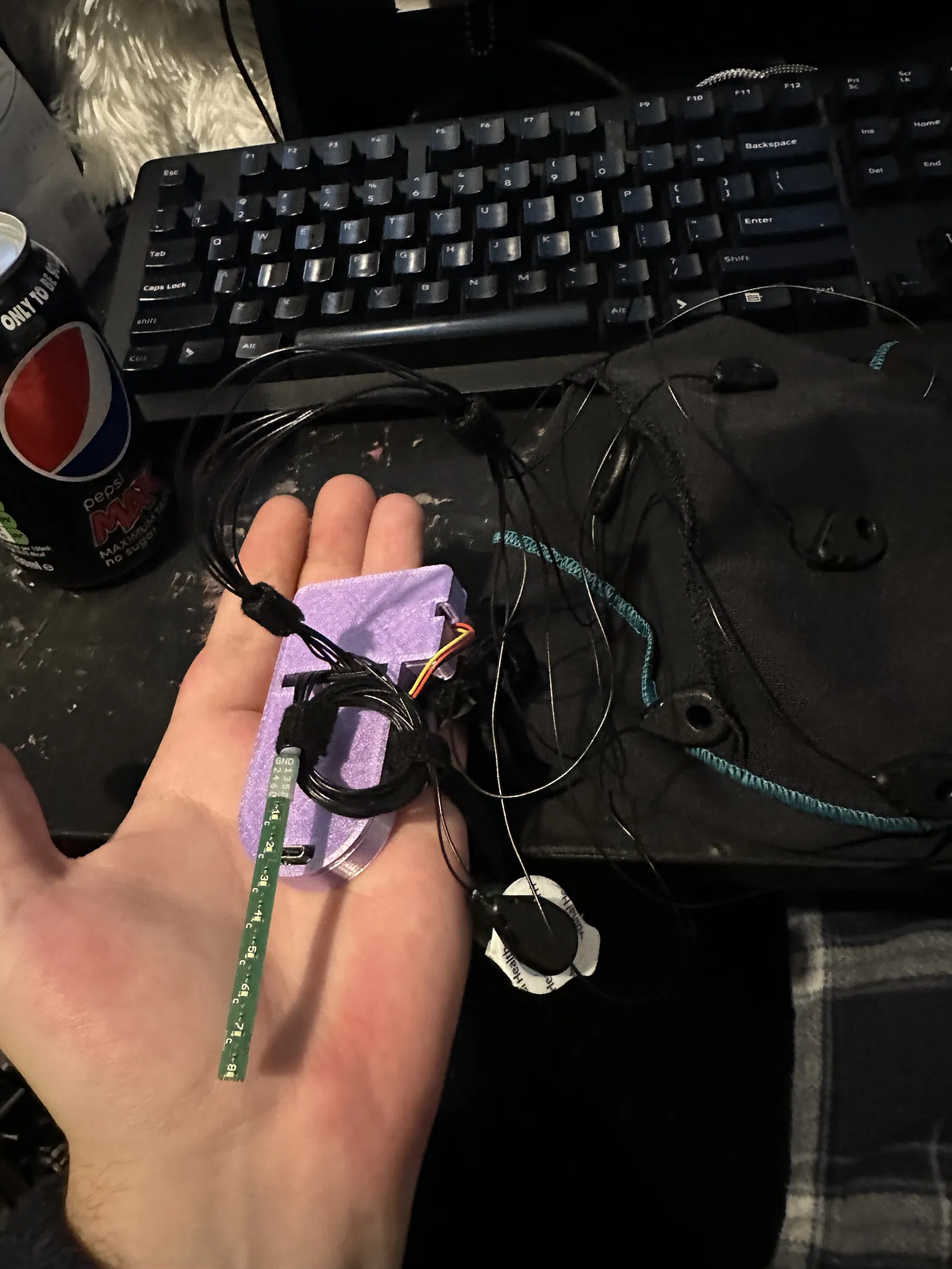 Có hai lỗ để luồn dây rút, một lỗ để buộc vào dây đeo đầu, và một lỗ để buộc mấy thỏi điện cực hoặc thanh LED thừa.