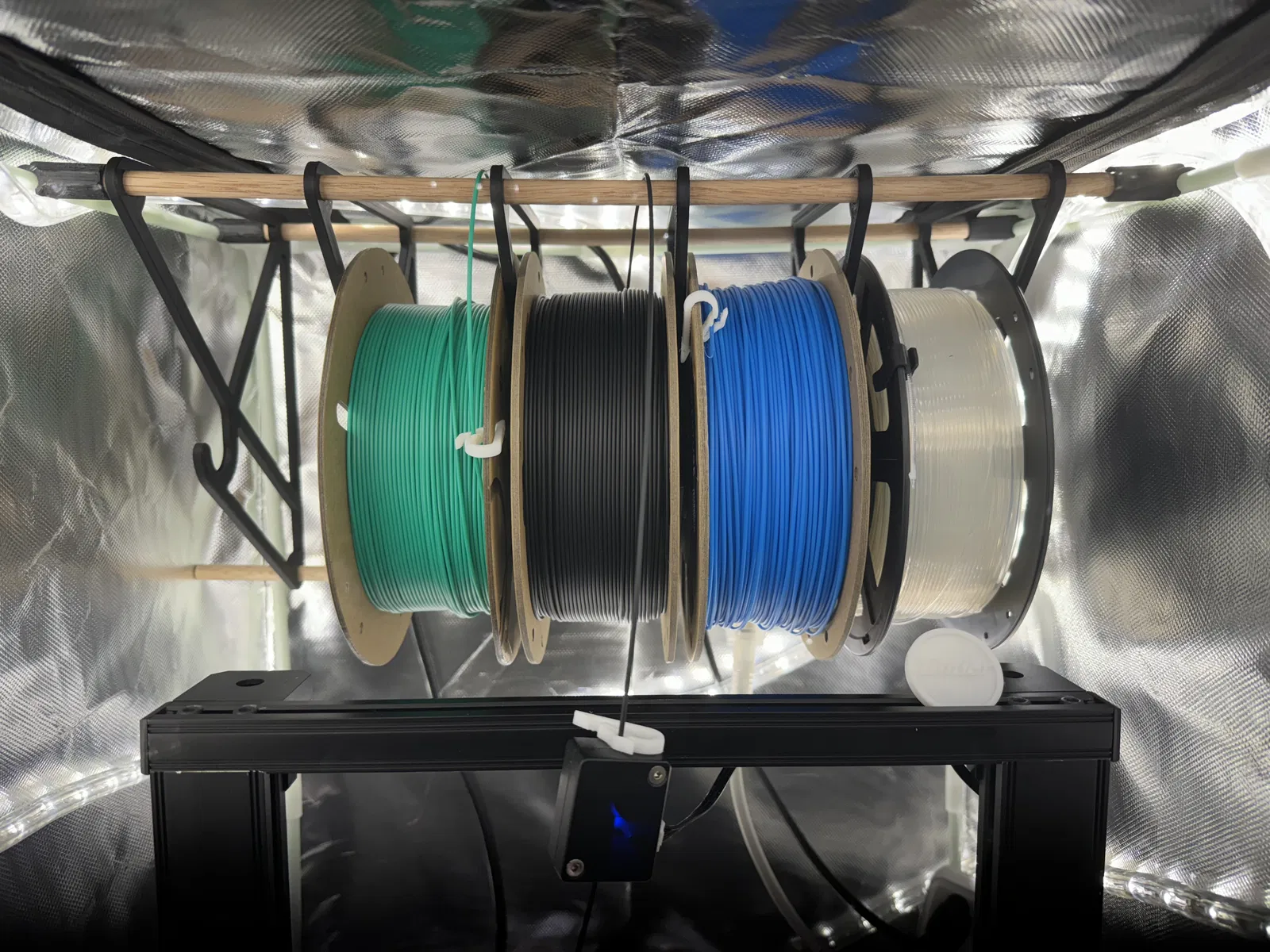 Lắp vào vị trí có thể hơi khó khăn, nhưng mình đã lắp được cả 6 bracket vào vị trí trong cấu hình của mình khá dễ dàng khi bắt đầu đặt cuộn dây vào. Cuộn dây dường như giúp giữ mọi thứ thẳng hàng vì trục và bracket có phần khớp nối để giữ trục không bị trượt ra ngoài. Các tấm adapter cho cuộn dây giúp giữ trục cố định và giữ cho mọi thứ không bị rung lắc nhiều. Mình thấy nếu không có chúng thì việc đặt cuộn dây vào giá đỡ khó hơn nhiều và hay bị rung lắc khi in.