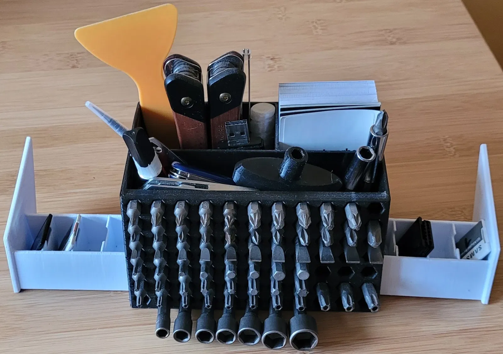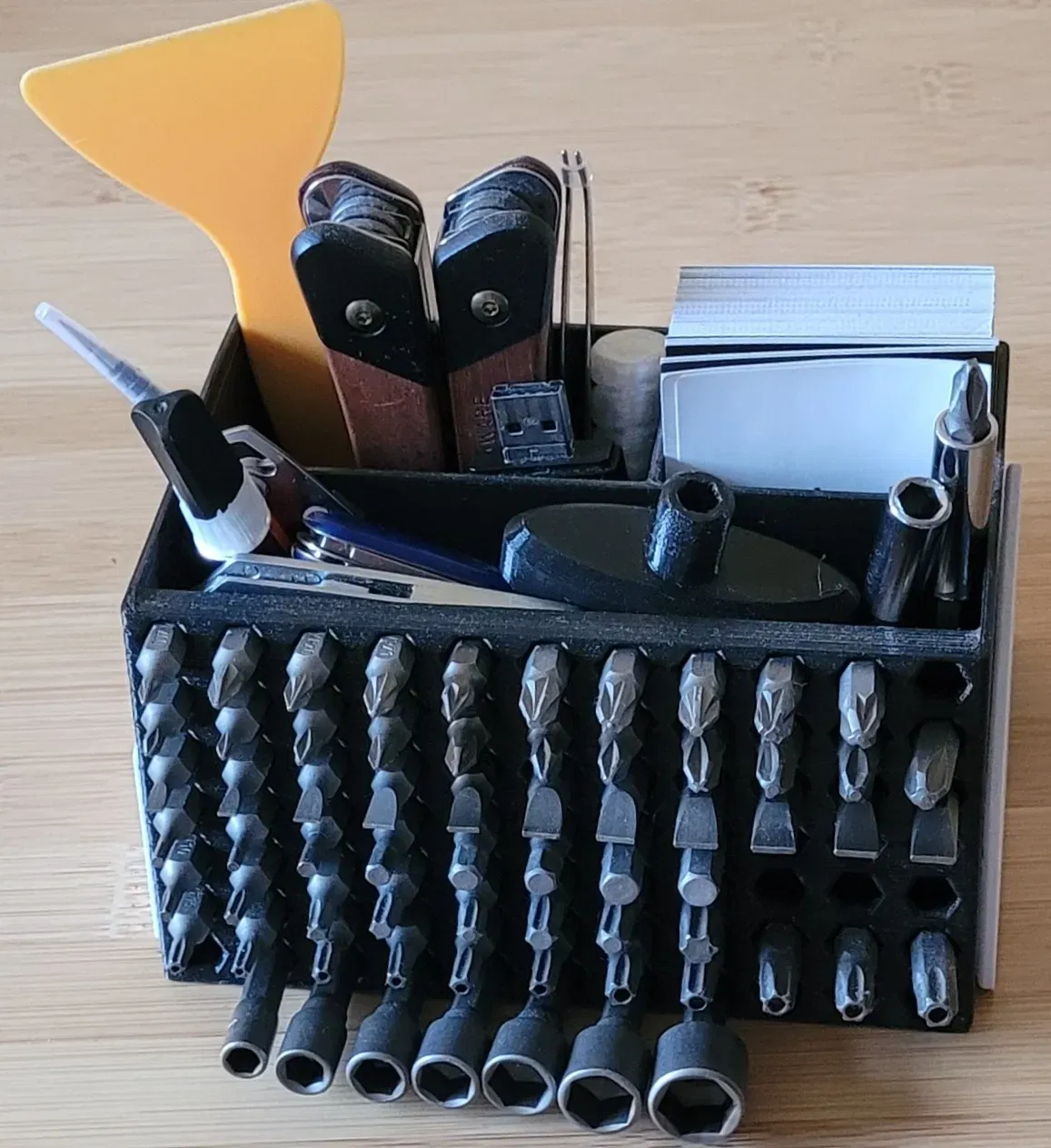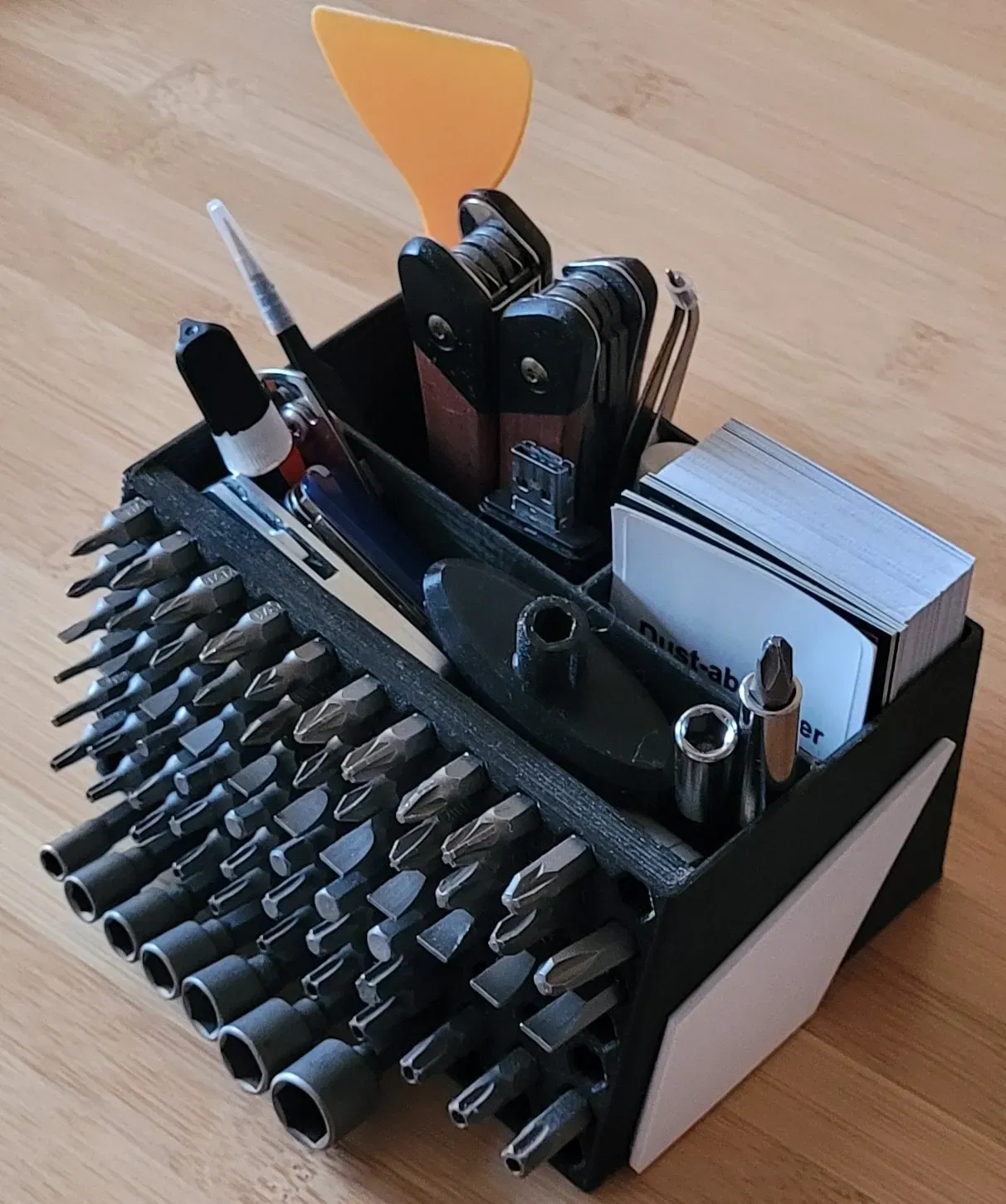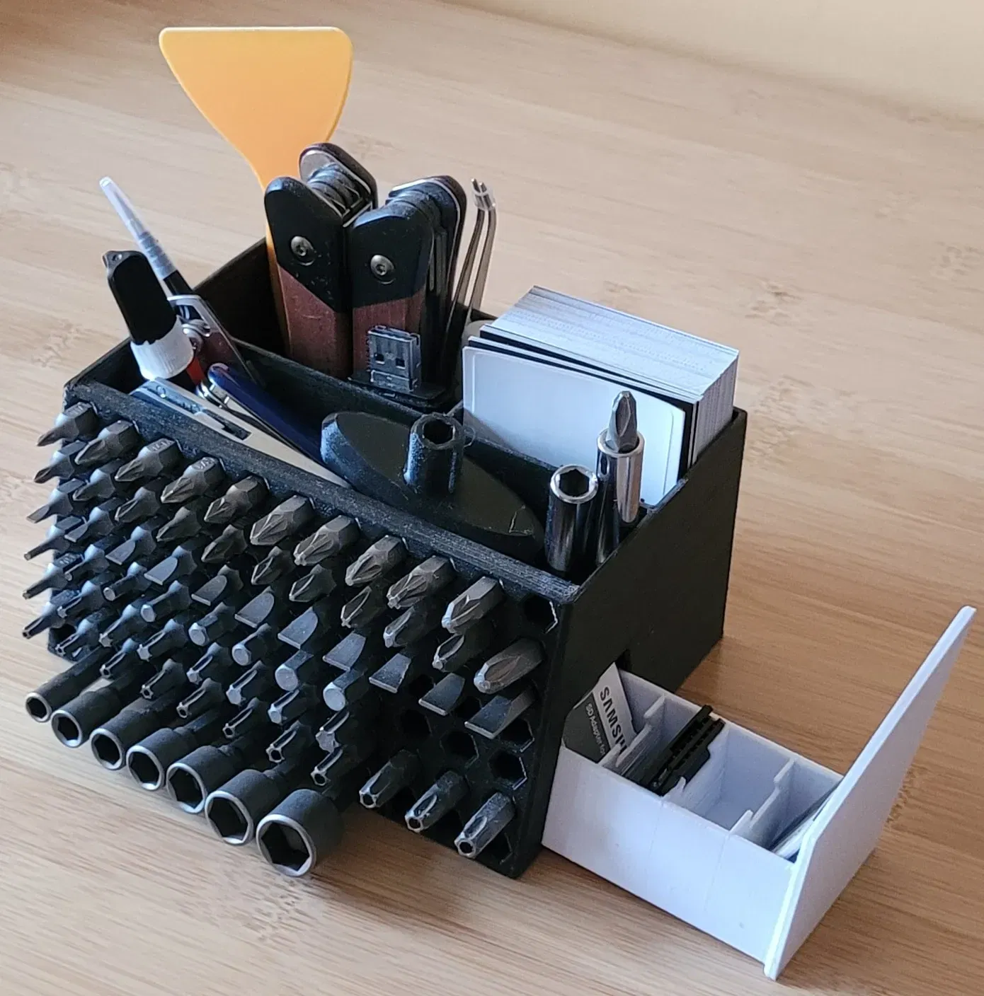 Bạn có thể tổ chức sdcard, bút, danh thiếp và bit tuốc nơ vít. Nó là một người tổ chức bàn rất nhỏ gọn.