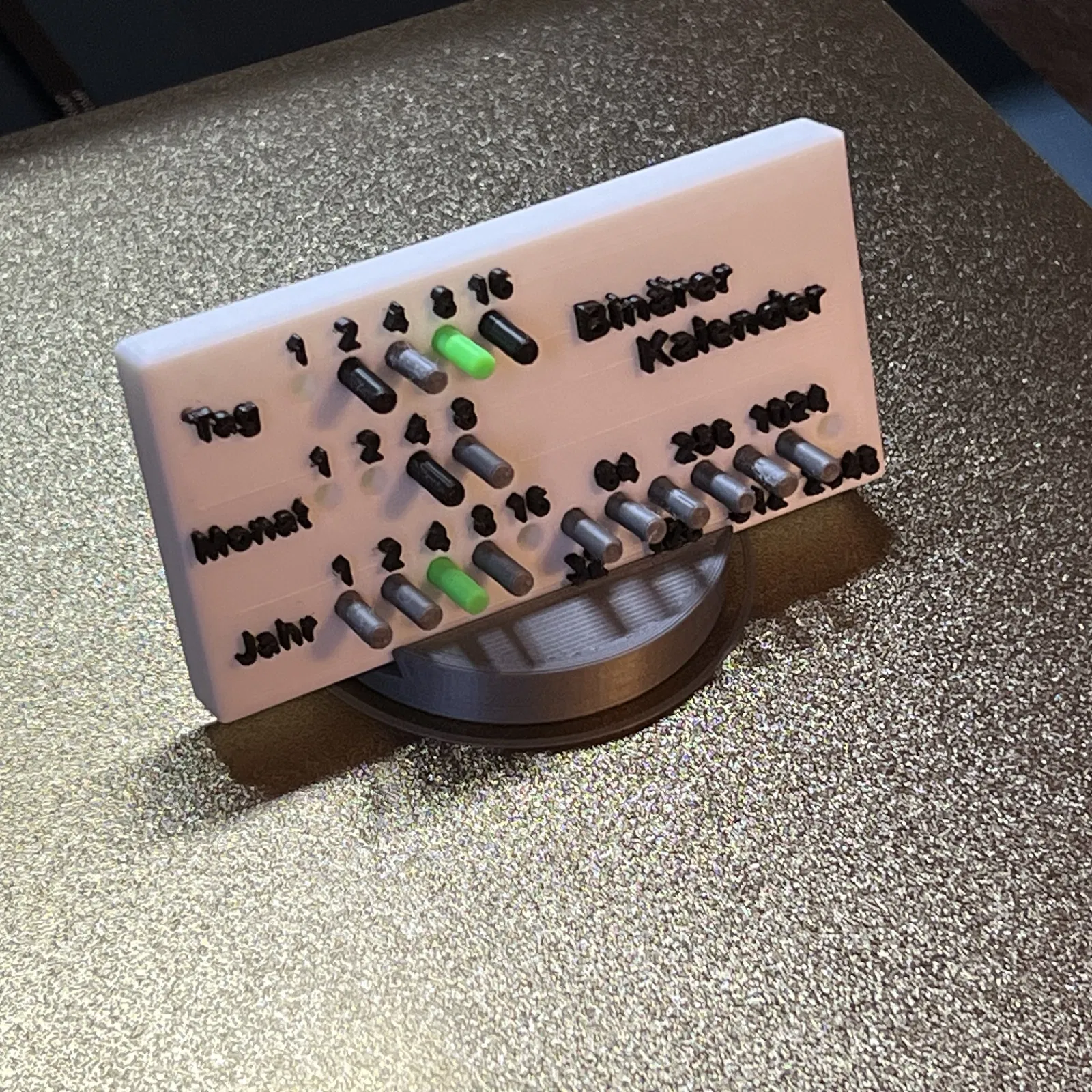Đây là một mẫu lịch nhị phân độc đáo, nơi bạn cộng các số lại để xác định ngày, tháng hoặc năm. Bản này có cả phiên bản tiếng Đức và tiếng Anh, với các bản cập nhật gần đây bao gồm chốt mới, chân đế tích hợp và đế được cải tiến.