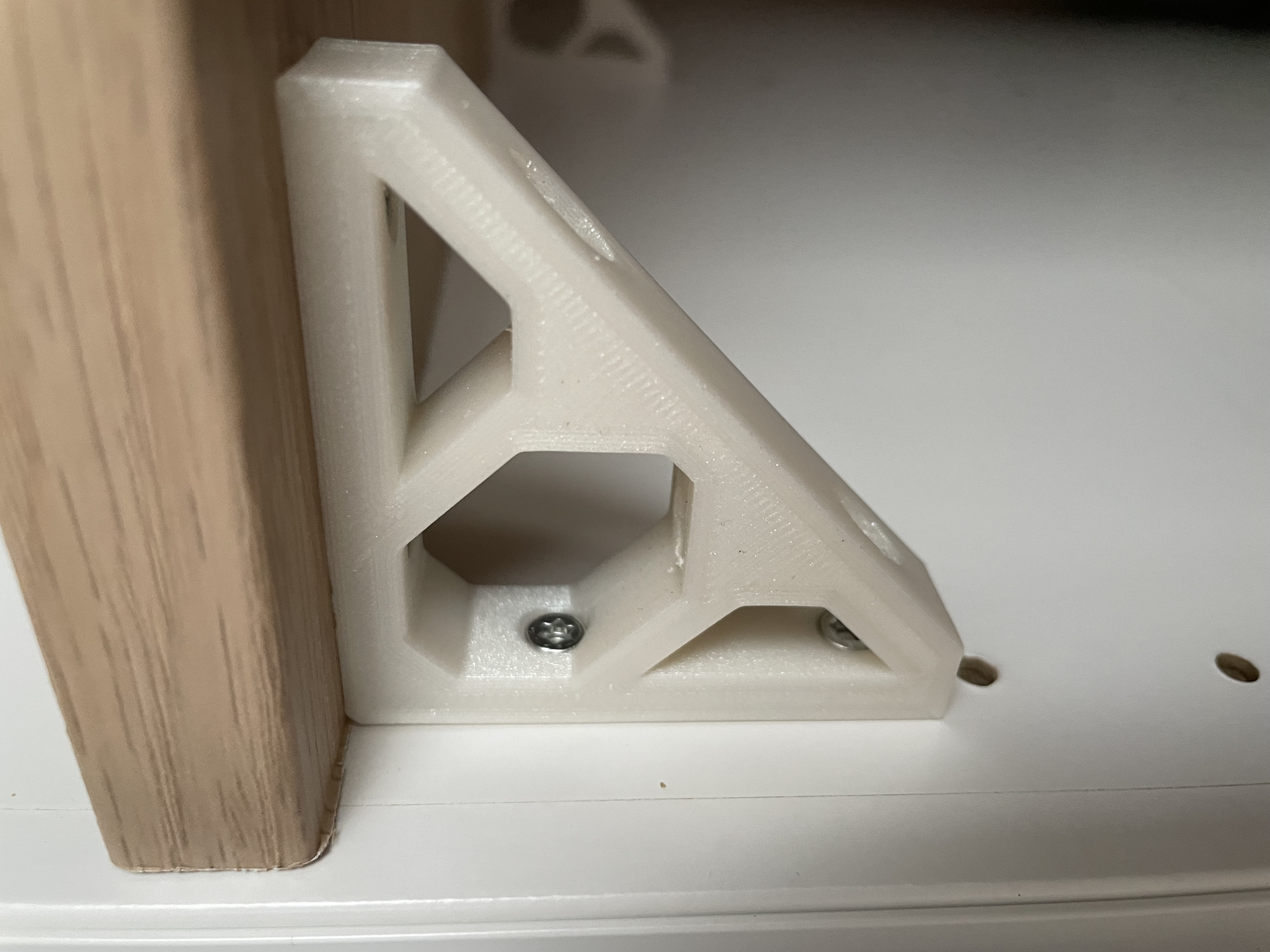 Giá đỡ kệ được gia cố chắc chắn cho các loại kệ, gắn vào kệ bằng vít gỗ 3.5x20. Không cần thêm cấu trúc hỗ trợ, khuyến khích dùng ABS để in.