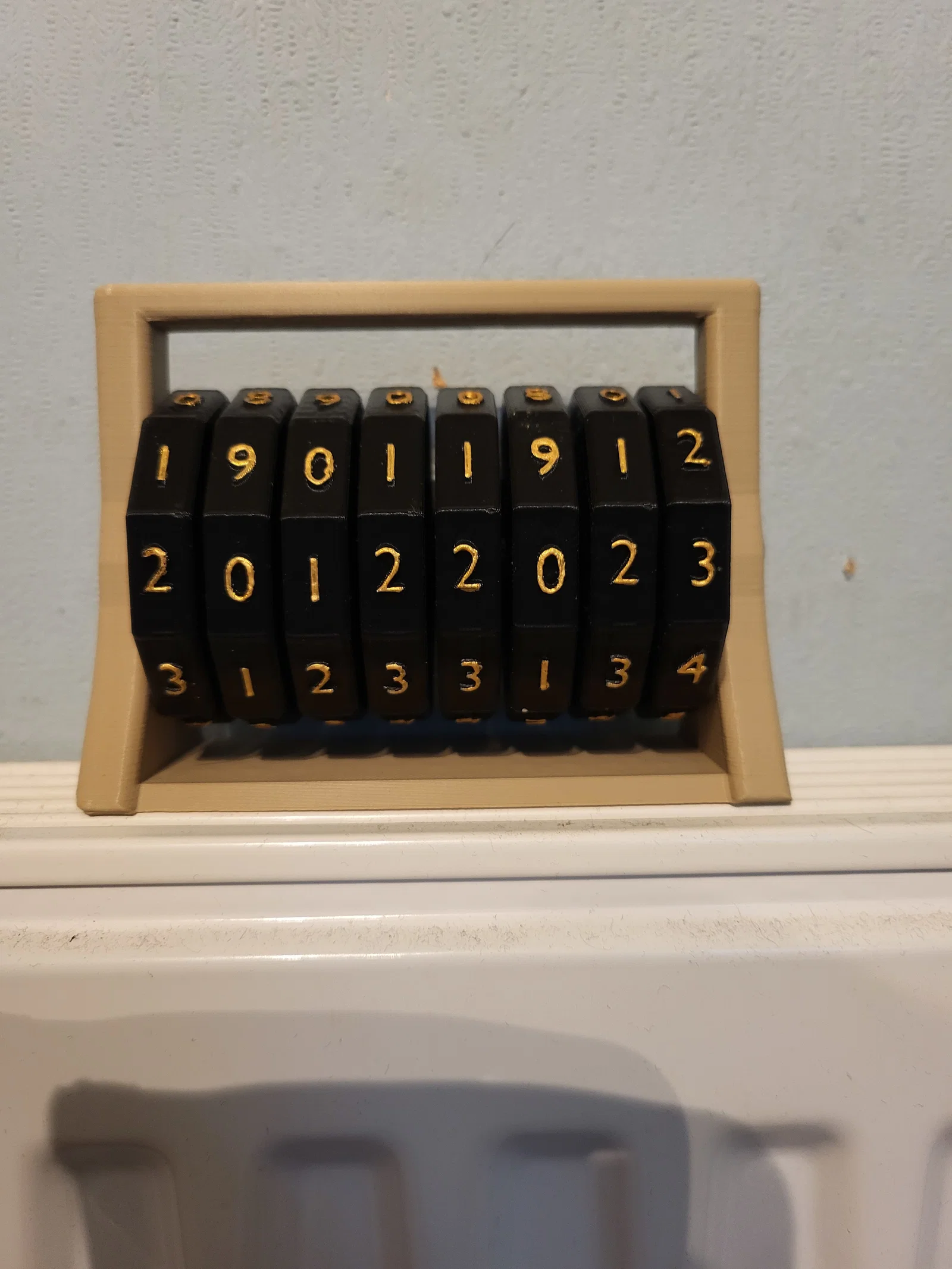 Bộ đếm ngày đơn giản này, cần khoảng 240 gram nhựa in. Bao gồm chân đế, 8 bánh răng số, bộ chia và vòng đệm.