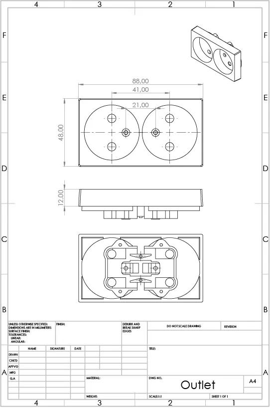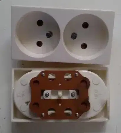 Bìa cho ổ cắm không nối đất từ những năm 80-90. Sản xuất tại Phần Lan. Mô hình này được làm sát nhất có thể với bản gốc và cần được làm bằng nhựa không chứa halogen vì lý do an toàn.