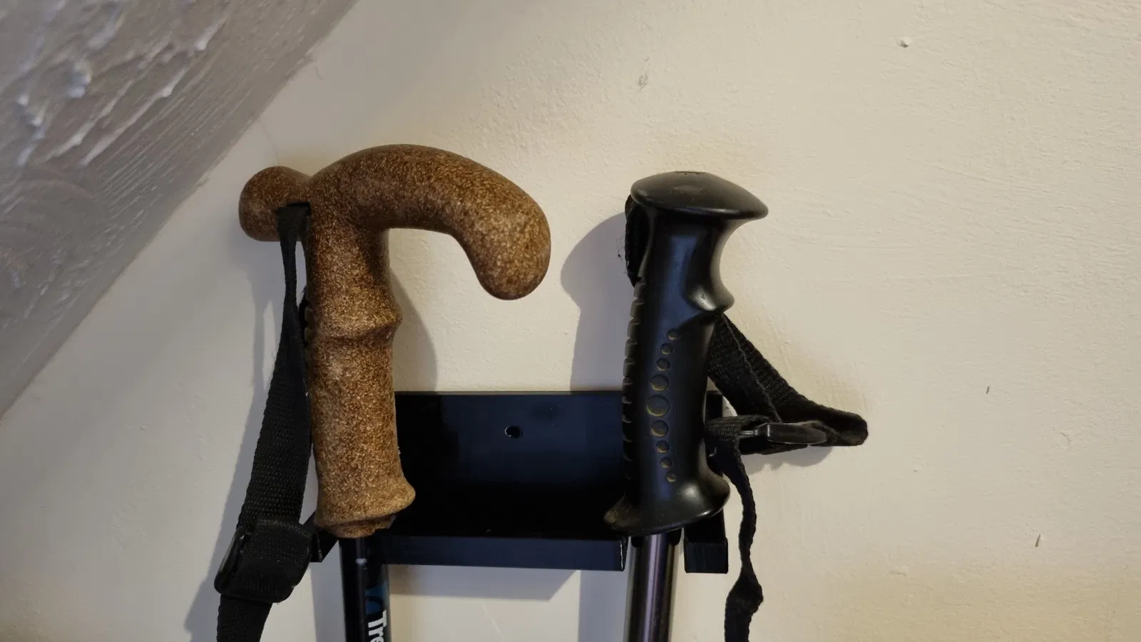 Giá treo tường để đựng hai cây gậy đi bộ. Sản phẩm được làm từ nhựa PETG với độ điền đầy 15%, đảm bảo sự chắc chắn và bền bỉ cho việc lưu trữ gậy của bạn.