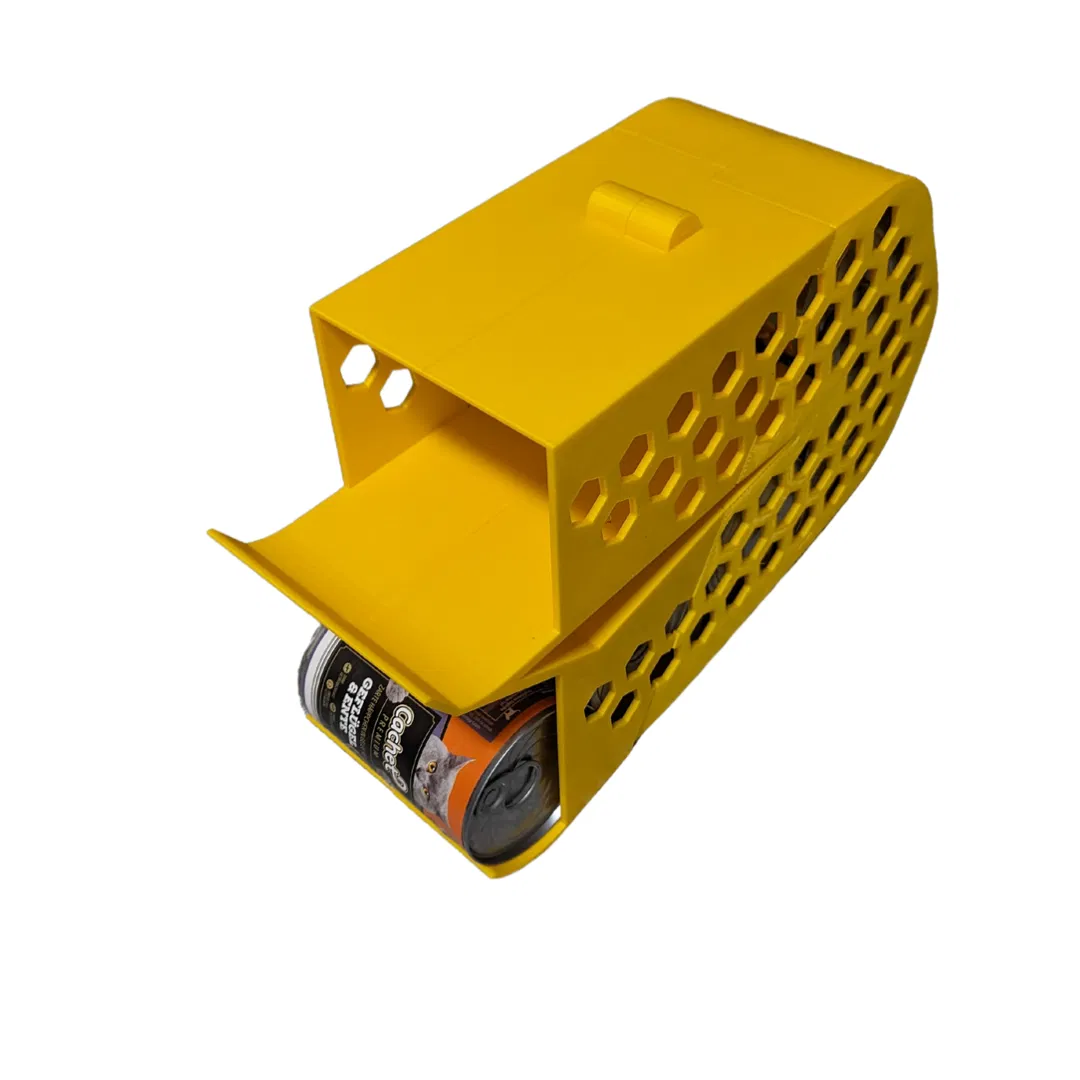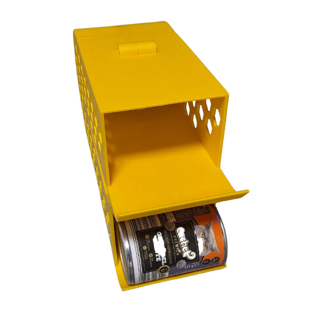 Hộp đựng thức ăn cho mèo chứa được 8 lon (Aldi, Penny, Lidl). Mô hình này được cắt thành 4 phần để dễ in hơn, yêu cầu supports và sử dụng chất liệu PLA với infill 20%. Sau khi in cần dùng 3 con ốc 2,9x13mm và keo để lắp ráp.