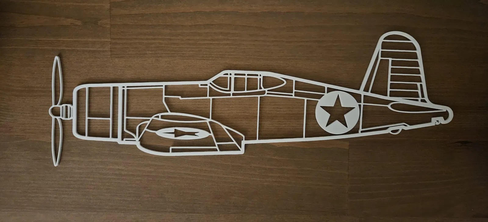Mô hình trang trí kiểu bản vẽ đơn giản của F4U Corsair. Phiên bản V2 có thêm cánh quạt mới. Thích hợp in bằng PLA, STL có sẵn. Có thể tùy chỉnh kích thước lớn theo ý muốn.