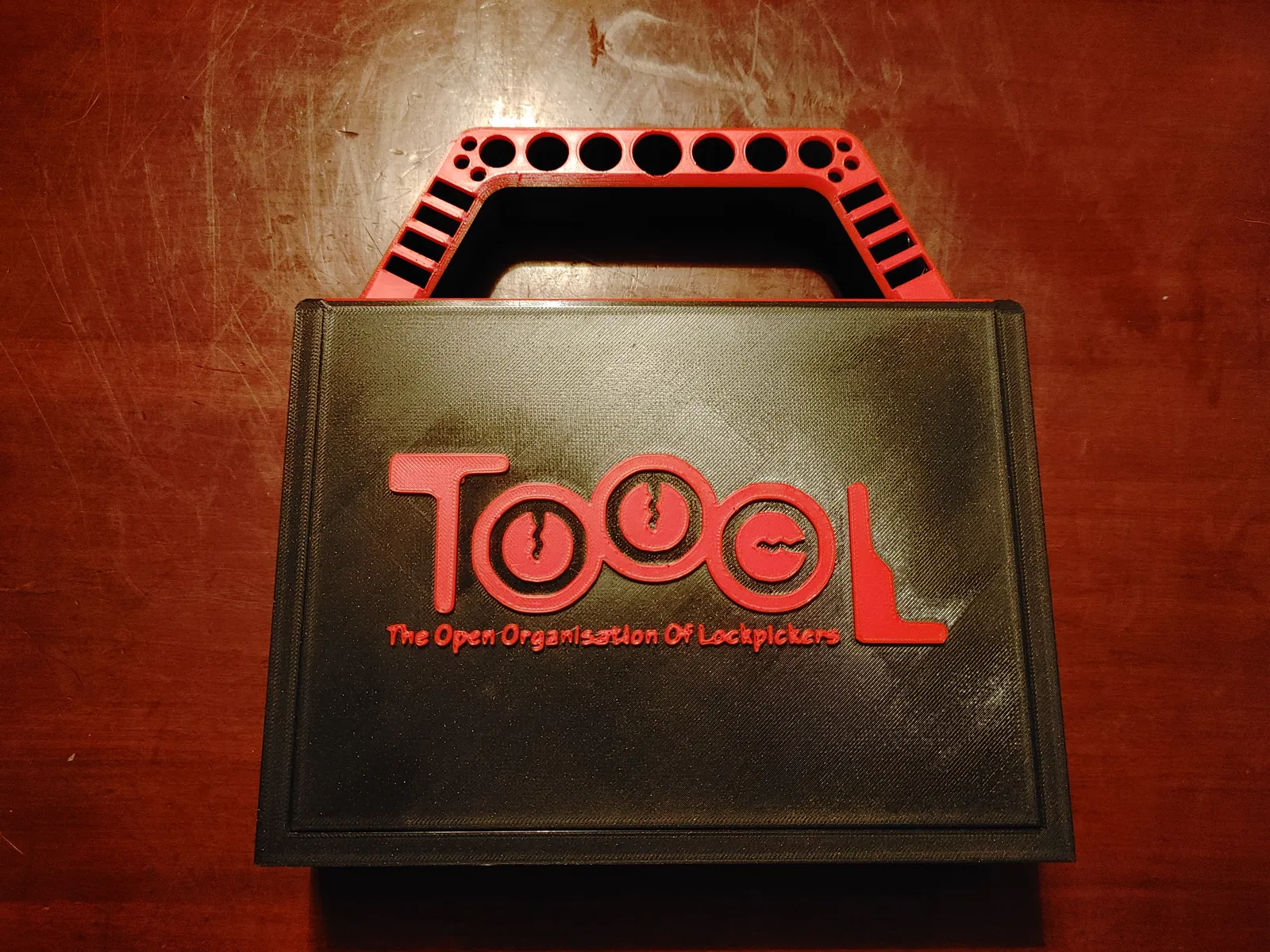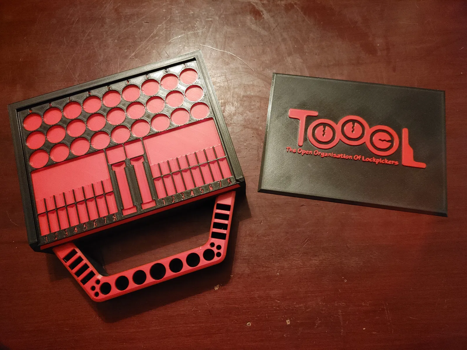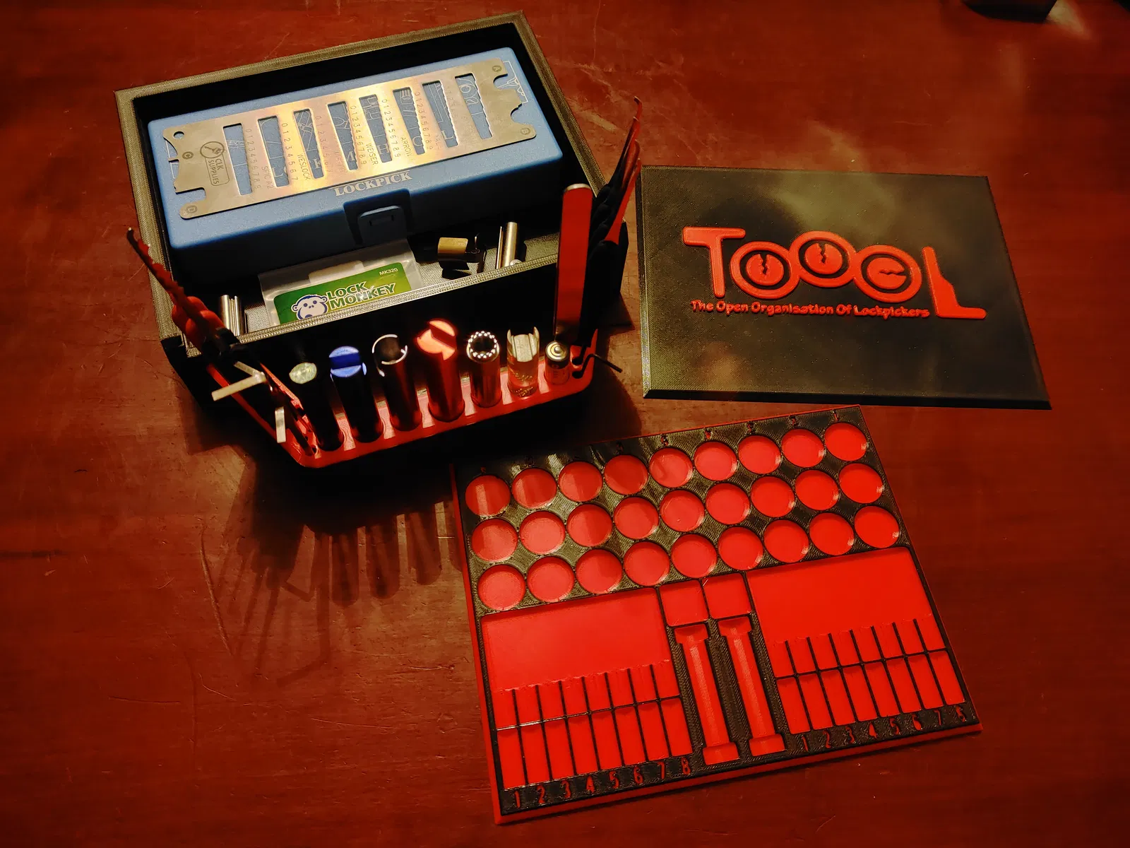 Một cái hộp TOOOL (The Open Organisation Of Lockpickers) để đựng dụng cụ tháo lắp ổ khóa, có tích hợp khay ghim (pinning tray) và trạm rã đông (gutting station). Khay ghim có các rãnh cắt cho ổ khóa pin tumbler và disc detainer. Trạm rã đông có các lỗ để chứa plug followers, pick và turning tools.