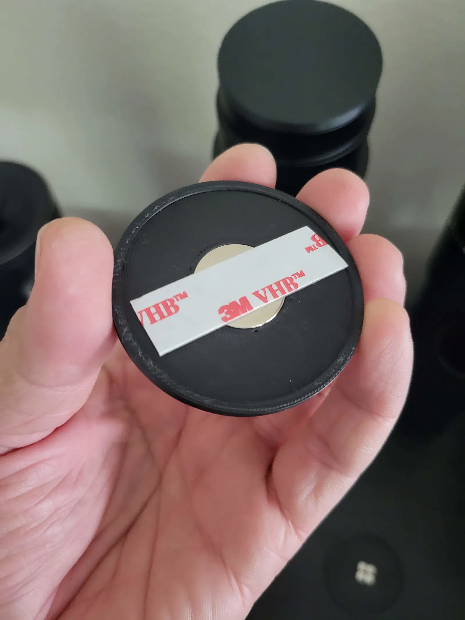 Sử dụng một nam châm 20x2mm đơn lẻ, hoặc xếp chồng một đến hai nam châm 20x1mm và trượt nó vào phần lõm của đế. Dán băng lên trên để giữ nó (xem hình ảnh). Tôi đã thêm một chút khoảng trống để băng dán phẳng. Bạn có thể điều chỉnh lực giữ của nam châm tùy thuộc vào phương pháp kết dính bạn đang sử dụng.